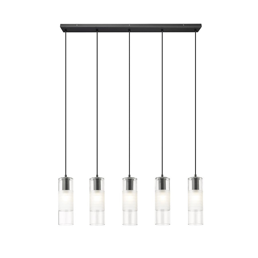 Tailored simplicity infuses a modern five-light linear chandelier with sophistication. Its matte black finish frame and robust housings offer a lovely complement to braided cloth covered cords that suspend each light in this island fixture, making it the perfect choice for refined but welcoming aesthetics in your kitchen or dining room.