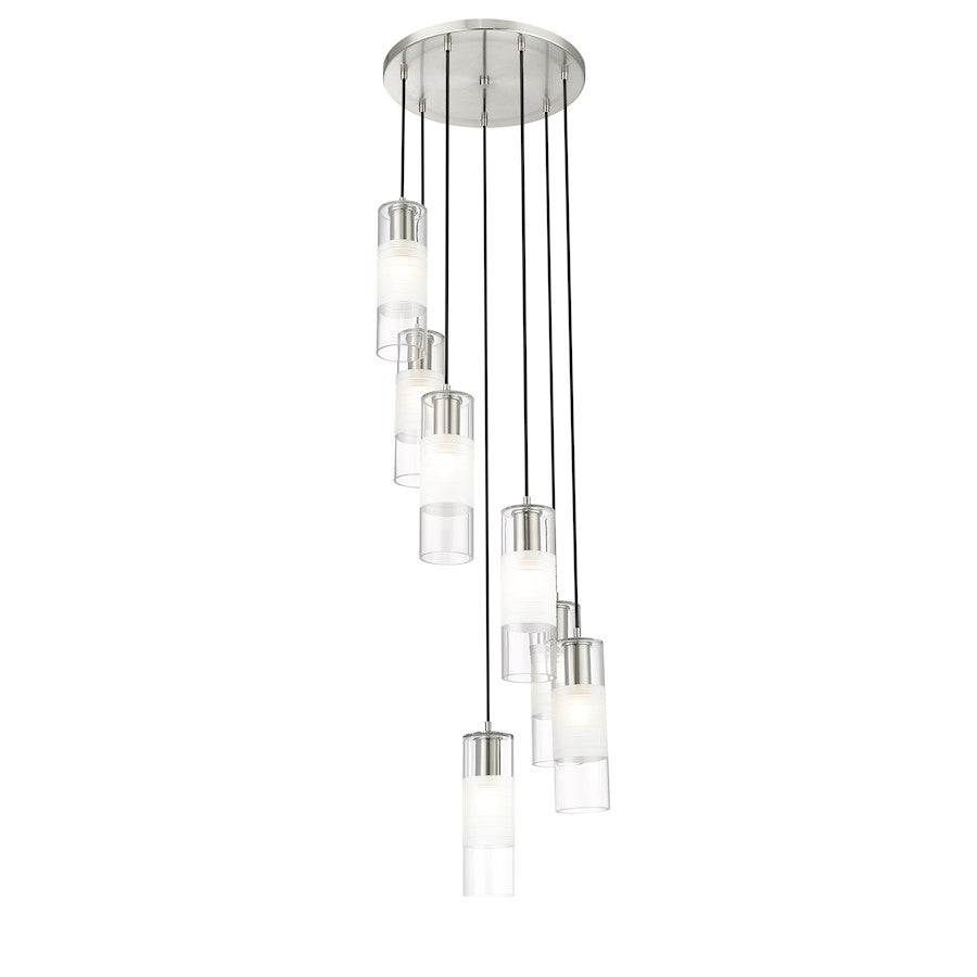 A simple spiral of lights creates a compelling silhouette for a modern seven-light chandelier. From the Alton collection, it's a refined, substantial fixture, pairing artisan clear and d frosted shades with robust housings to create a sense of detail that enhances without overwhelming. A brushed nickel finish is crisp and contemporary, beautiful over a welcoming foyer or dining table.