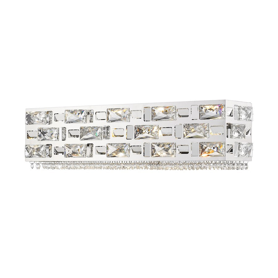 A contemporary space receives the ultimate in glamour and style with this unforgettable chrome and crystal light vanity light. Accentuate a custom bath space with a luscious fixture featuring cut-out rectangles and crystal emblems, and send a strong message reflecting upscale signature style.