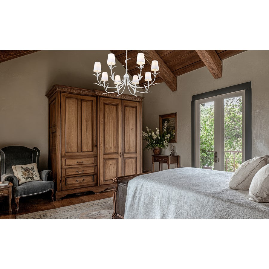 Invite a botanical artisan look to a dining room, foyer, or bedroom with an elegant eight-light chandelier devoted to a depiction of nature. With textured white finish steel framing, its curved arms and delicately shaped frond accents create a statement-making look of custom design, completed with smooth holders and candelabra bulb bases as dimmable lighting completes a chic fixture.
