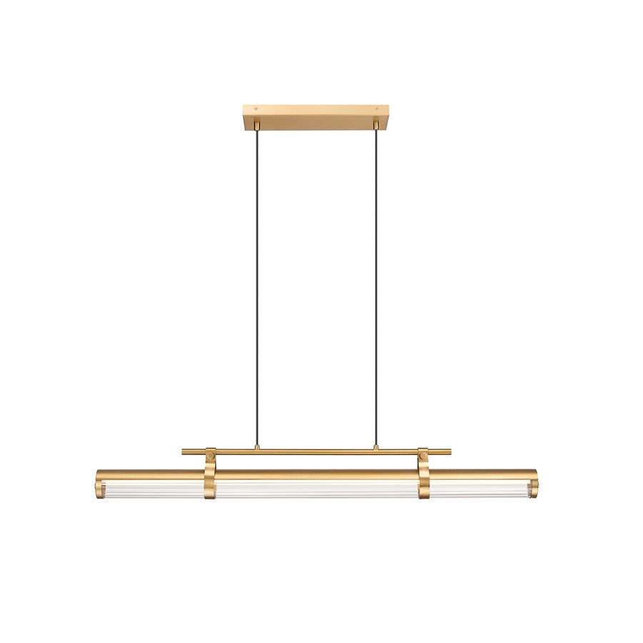 An airy, light presence embellishes the modernist look with deco influence as this single-light linear chandelier makes a design statement. Timeless style sends LED lighting through a clear reeded glass cylinder shade with dimming features, and lifts elegance with its modern gold finish metal framing. Cable suspension and chic accent details offer a new twist in lighting for an updated look.