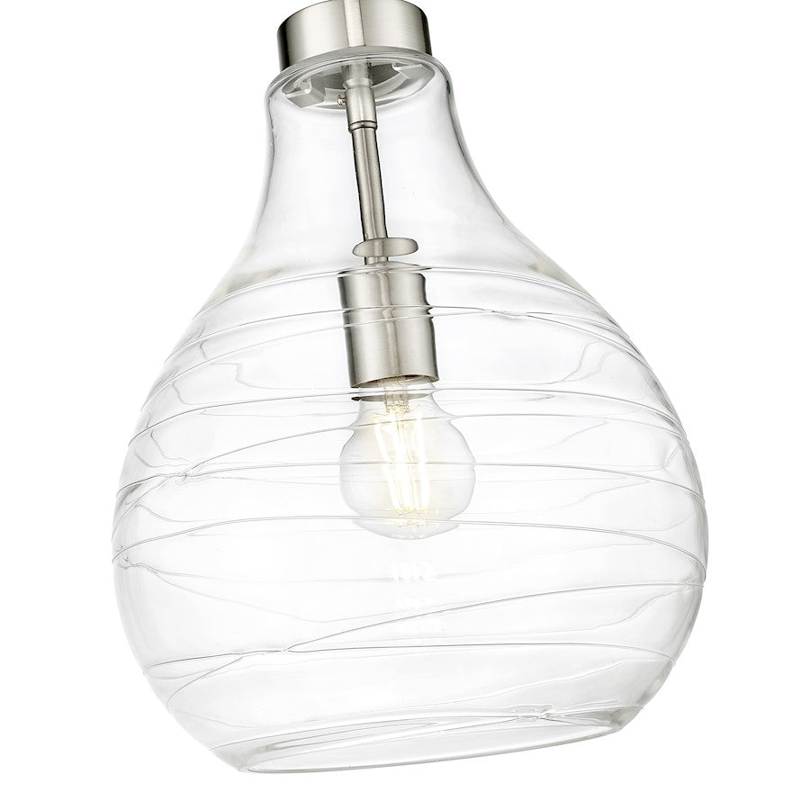 Artisanal ribboning highlights curvy clear glass to create a statement-making look and feel for a modern one-light pendant. Charming in brushed nickel, it boasts a crisp, clean silhouette that brims with character as the dimensional shade refracts light to reduce glare and create an inviting ambiance in your home.