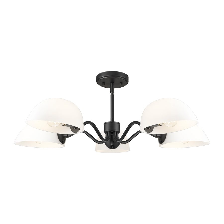 Choose stylish flexibility and versatility with this modern five-light chandelier. It pairs elegantly domed opal glass shades with curvy arms and a matte black frame finish, delivering impressive depth and character over living, dining and bedroom spaces. The shades rotate to cast up or down lighting to suit your preference and space.