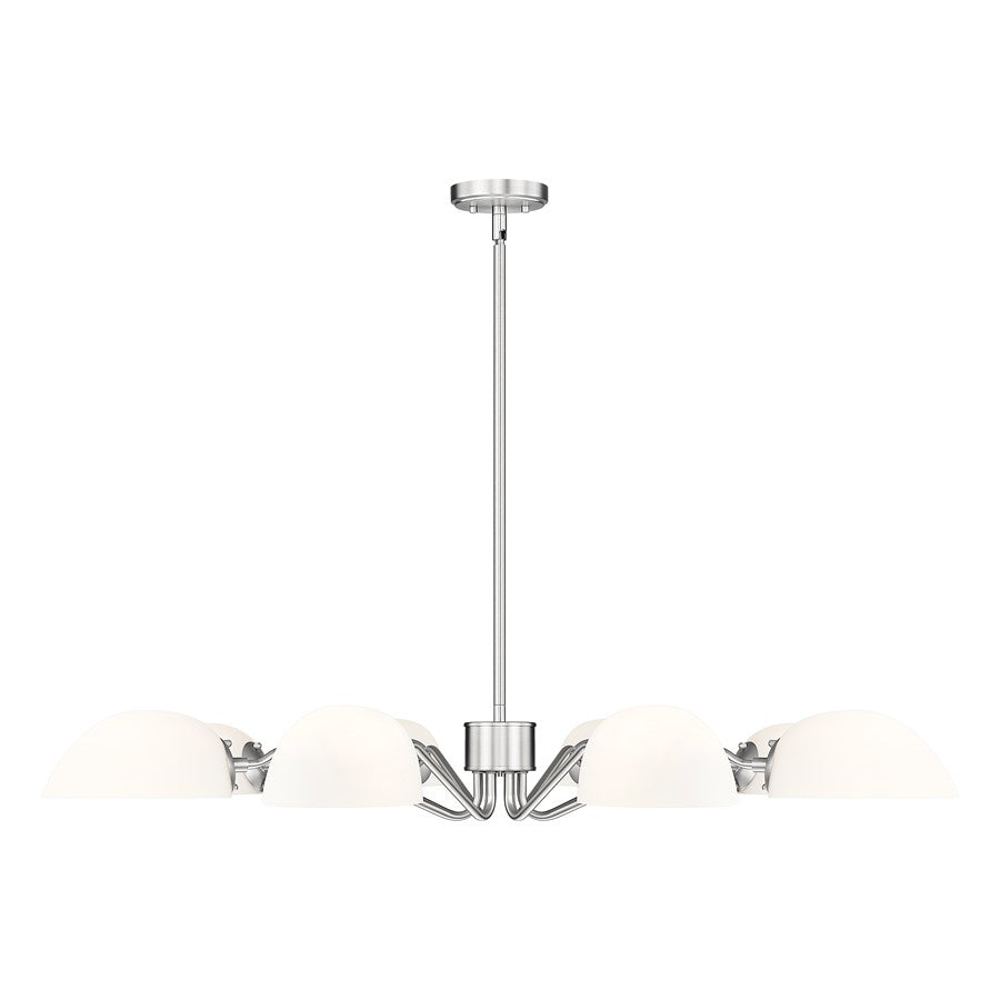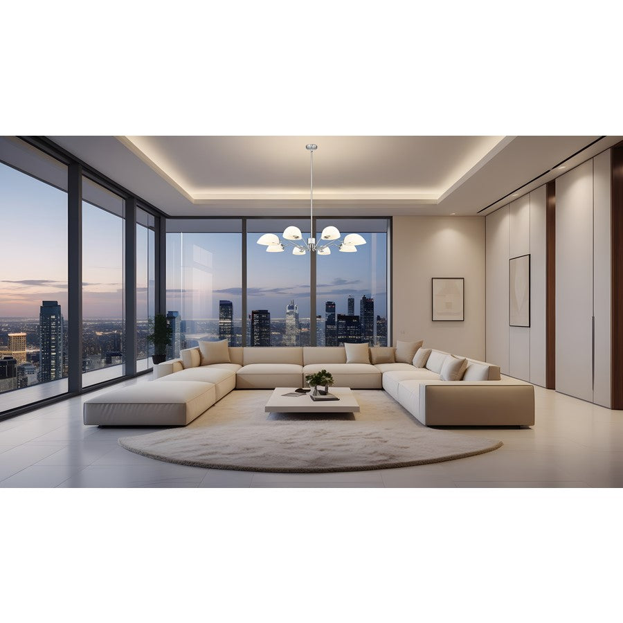 Light up a large space with the generous size of this modern eight-light chandelier. Delicately curves arms add personality, while reversible domed shades cast soft, inviting illumination either up or down. A brushed nickel finish is a timeless touch that complements in virtually any space.