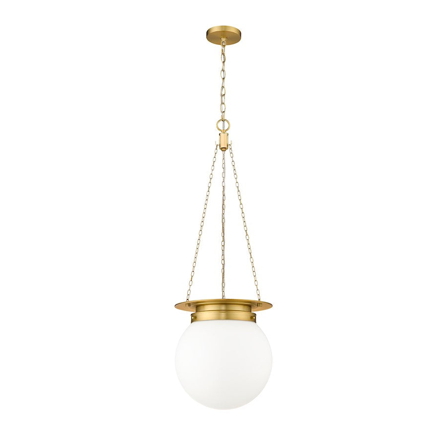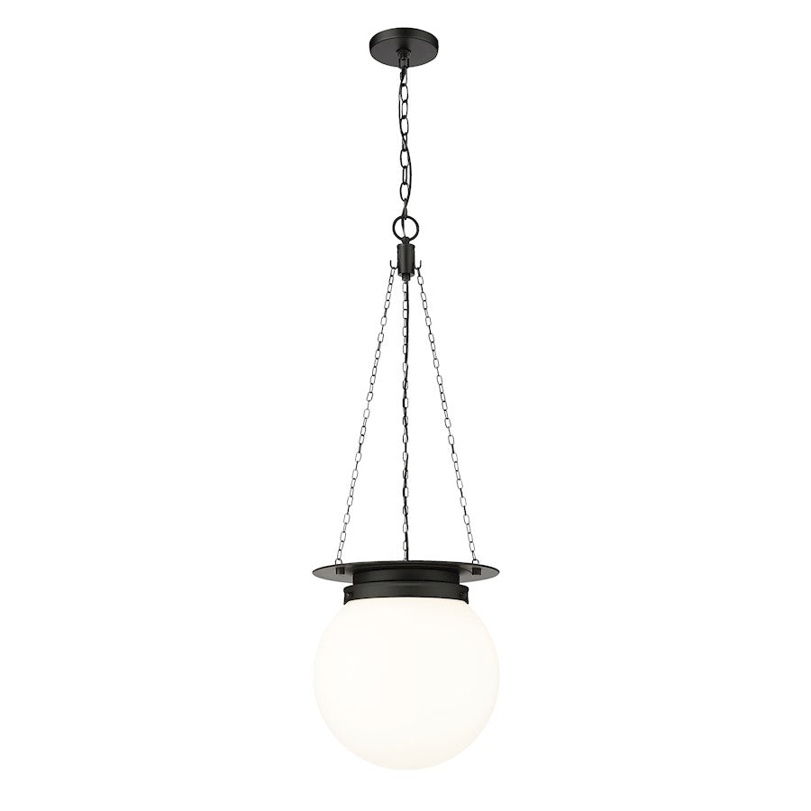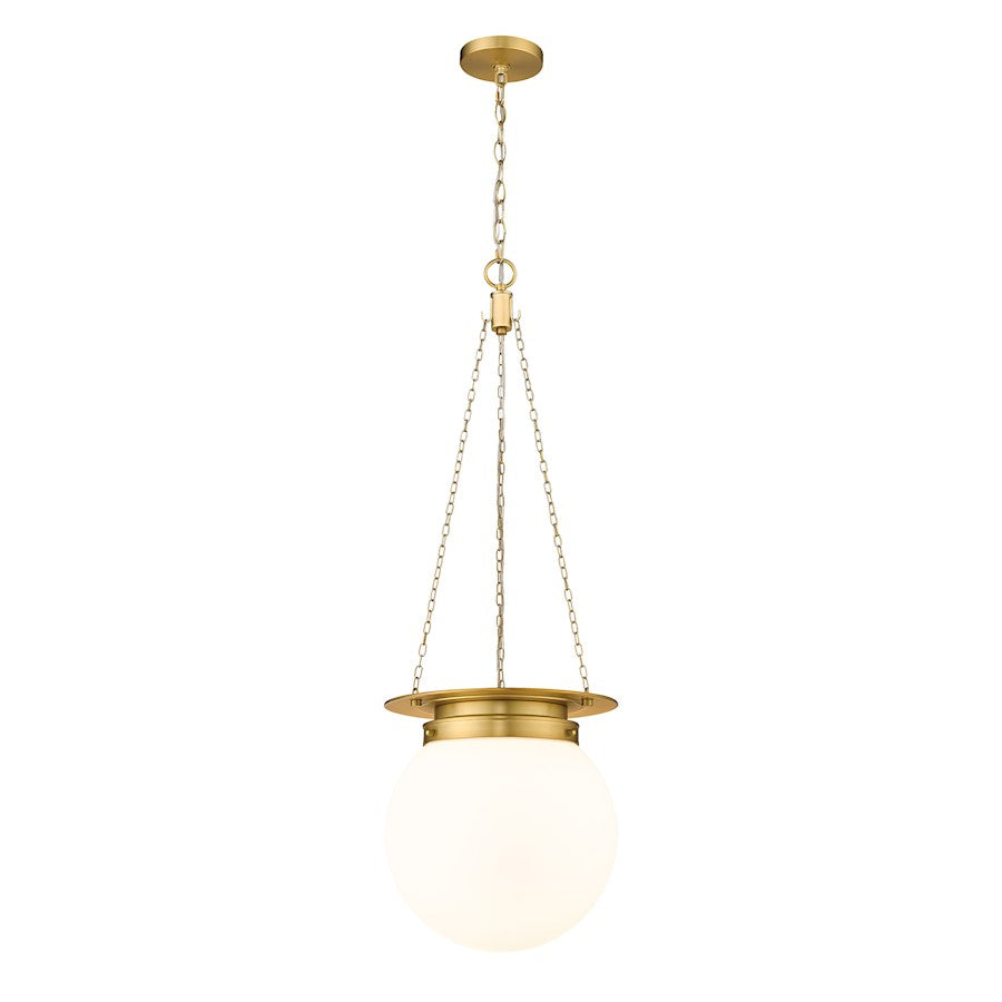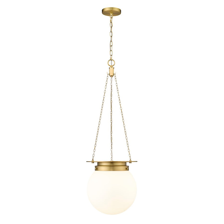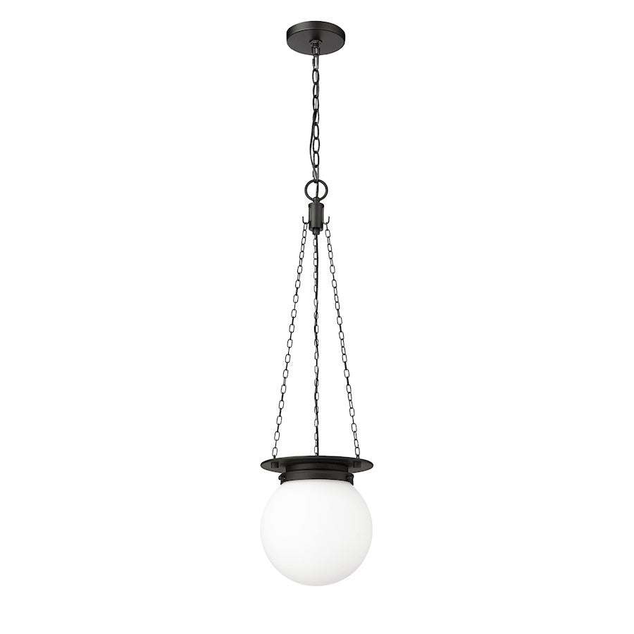 - The Calhoun lantern pendant fuses classic elements of Mid-Century Modern and Schoolhouse looks to create a fresh contemporary style for today’s interiors. The milk glass globe takes center stage, surrounded by a cuff of steel distinguished with raised architectural grommets. A triple chain evokes a rich, vintage look, along with fine details such as the matching ceiling canopy. This distinctive pendant will set a modern tone in the entry or hang in multiples over a kitchen island or bar. Available in Heritage Brass, and Matte Black.