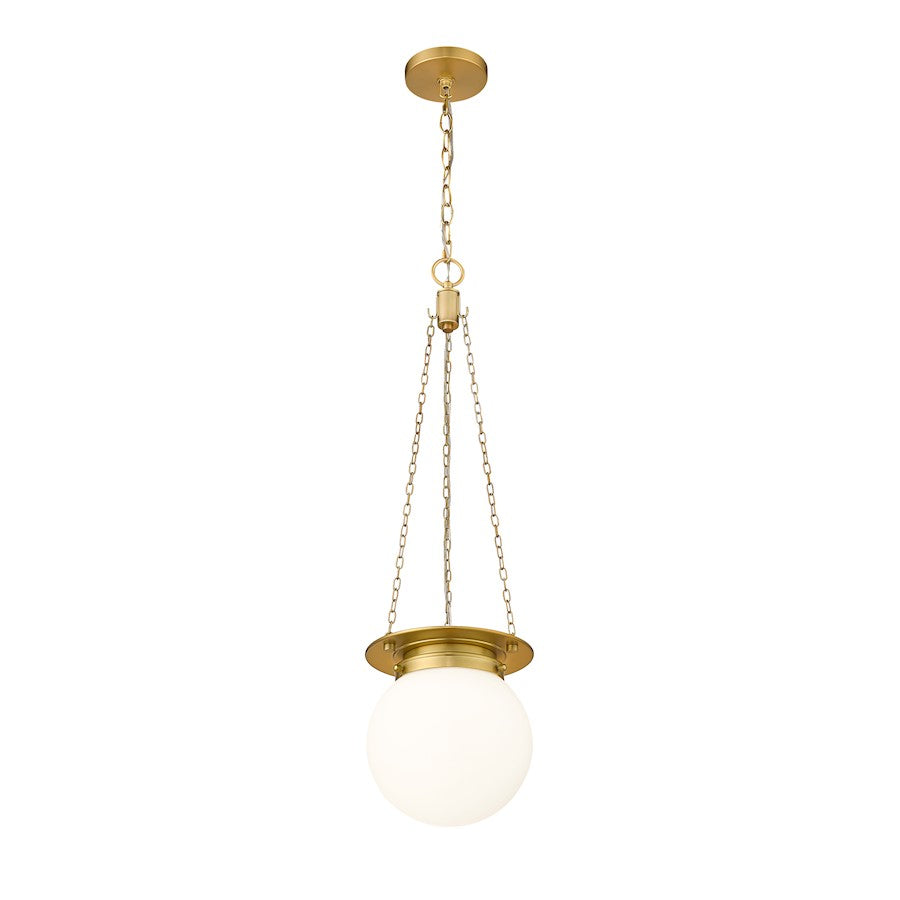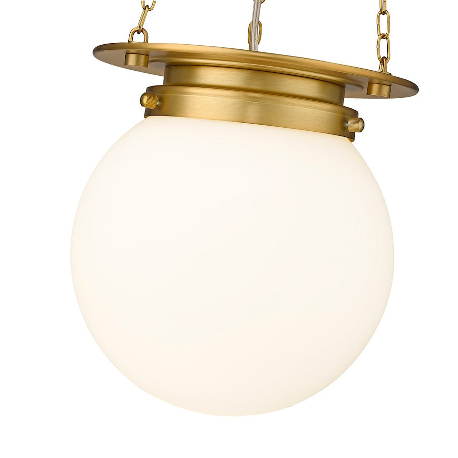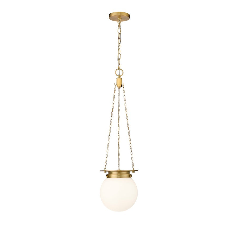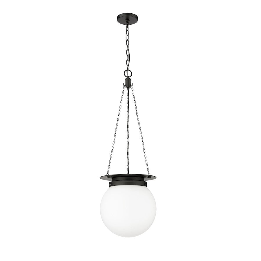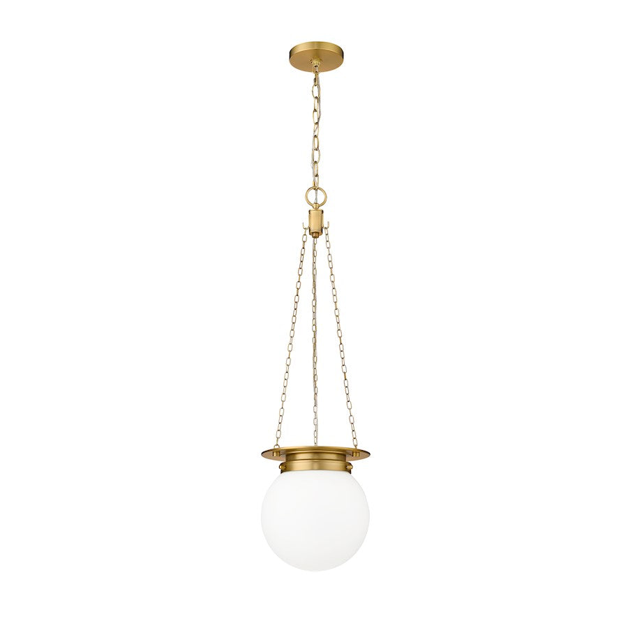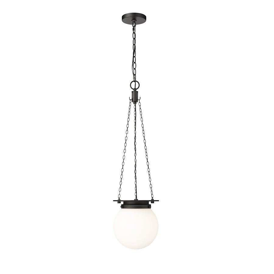 - The Calhoun lantern pendant fuses classic elements of Mid-Century Modern and Schoolhouse looks to create a fresh contemporary style for today’s interiors. The milk glass globe takes center stage, surrounded by a cuff of steel distinguished with raised architectural grommets. A triple chain evokes a rich, vintage look, along with fine details such as the matching ceiling canopy. This distinctive pendant will set a modern tone in the entry or hang in multiples over a kitchen island or bar. Available in Heritage Brass, and Matte Black.