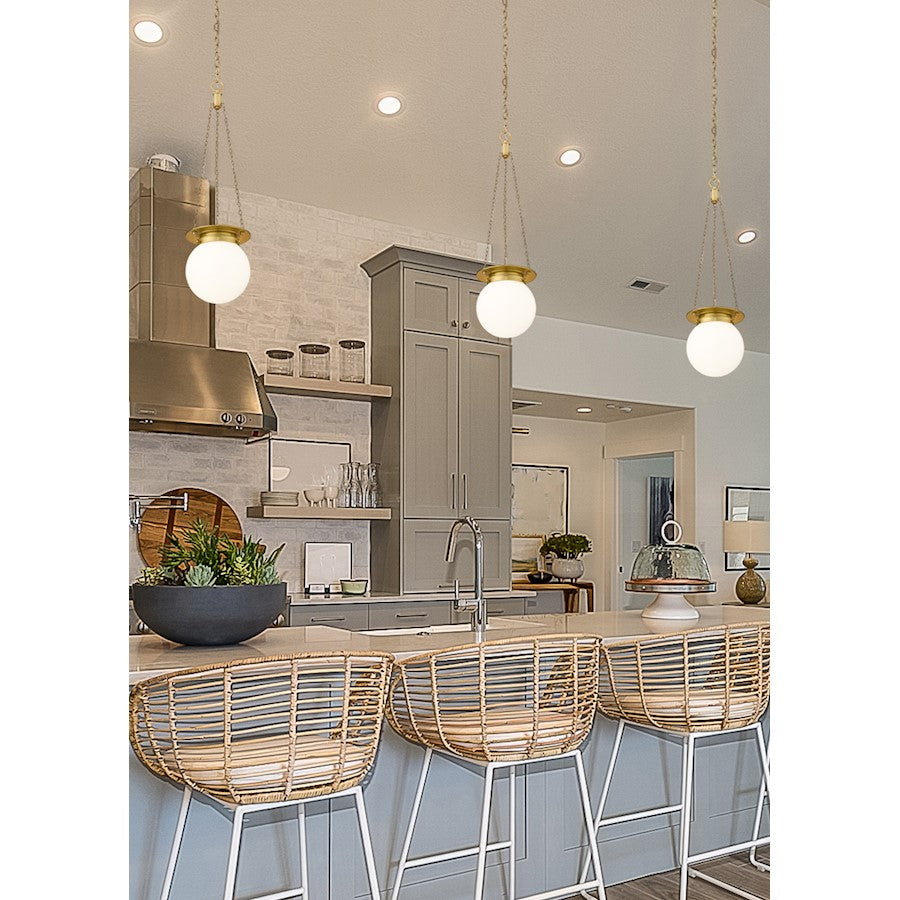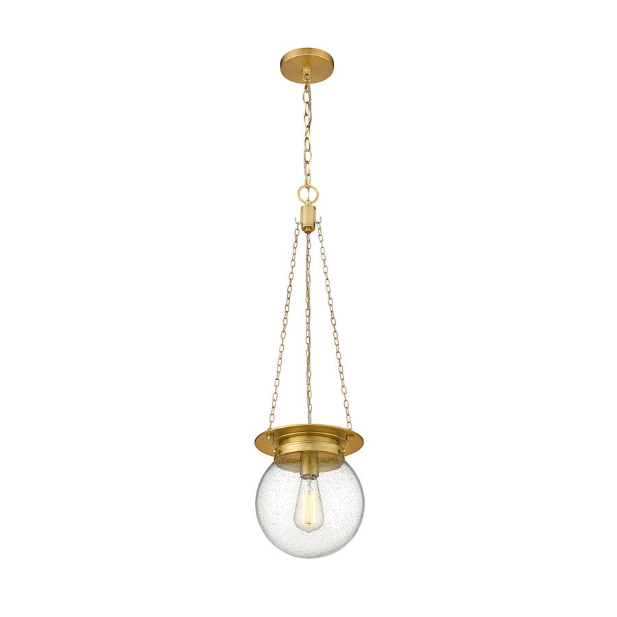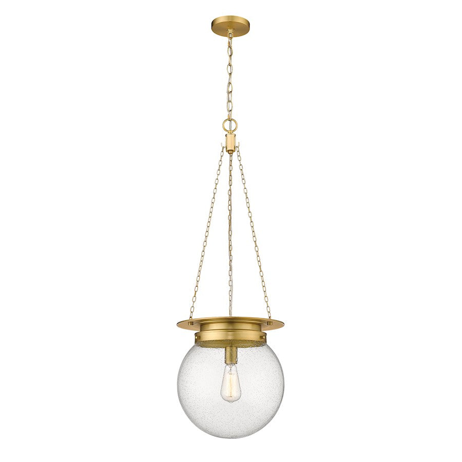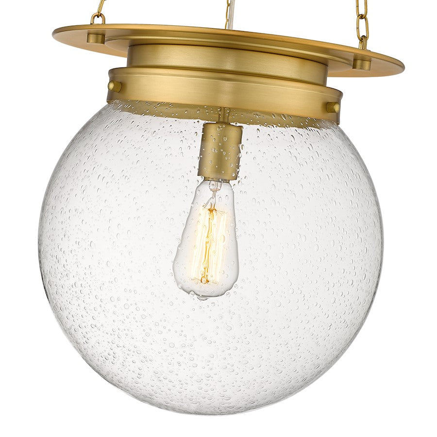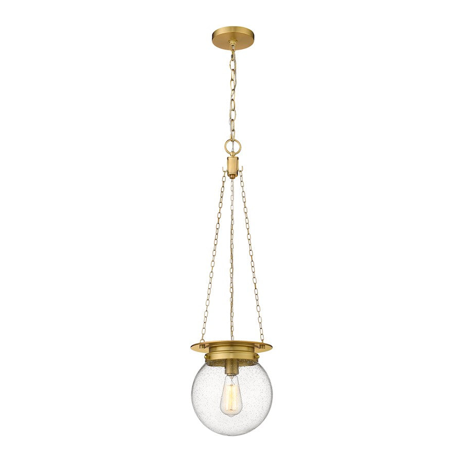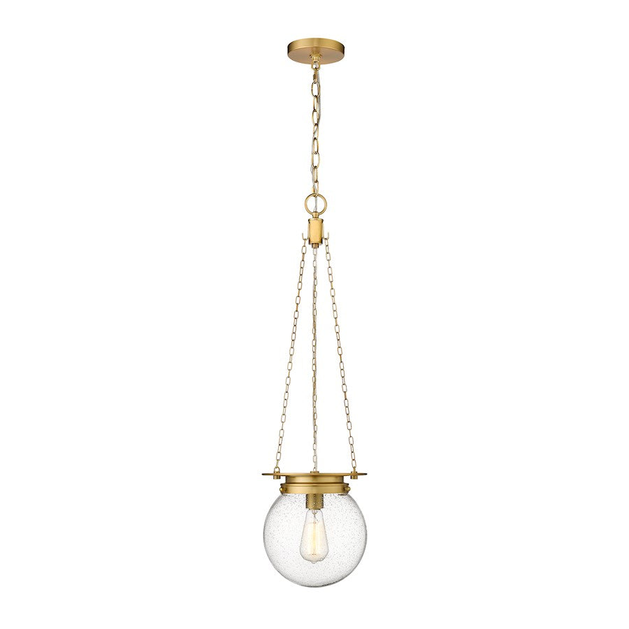 Harken back to Mid-Century Modern fare with a bit of schoolhouse charm thrown in and appreciate the easy feel of a light fixture that works wonders in both contemporary and transitional settings. This one-light pendant from the Calhoun collection delivers a shapely, symmetrical silhouette with a frame and accents featuring heritage brass finish metal. A festive clear seedy glass globe shade adds a dose of elegance suitable for a main living space, dining area, or foyer.