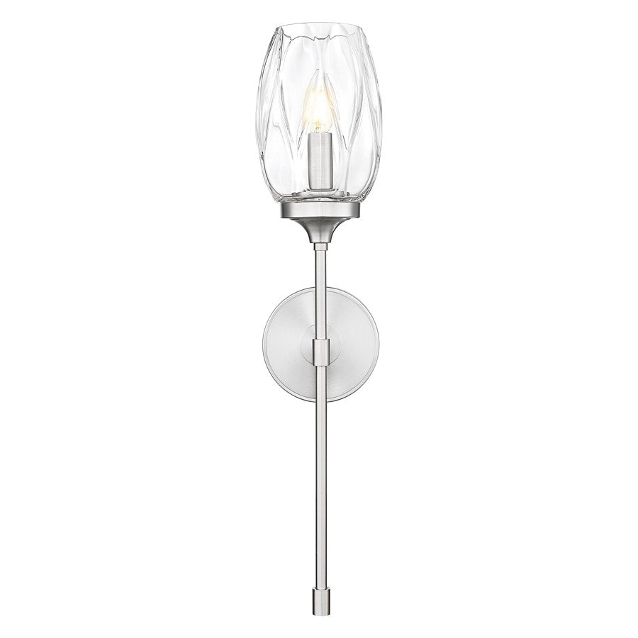 Tulip glass with a subtle textured pattern perfectly enhances the clean lines and elegant structure of this transitional one-light wall sconce. A long, slim stem evokes a flower or a wine goblet, adding the perfect dose of character in your lounge, living room, or bath. A brushed nickel finish and smooth, round wall plate complete the look.