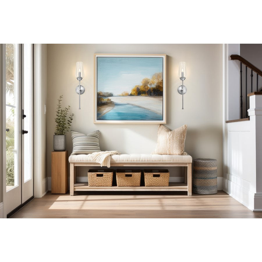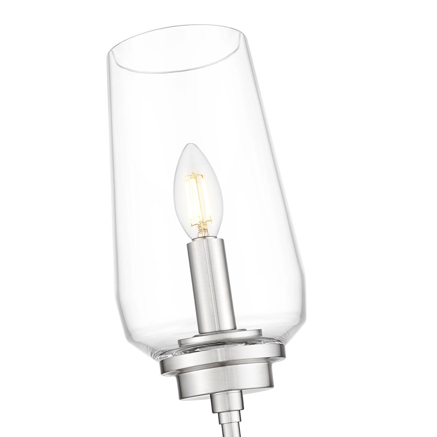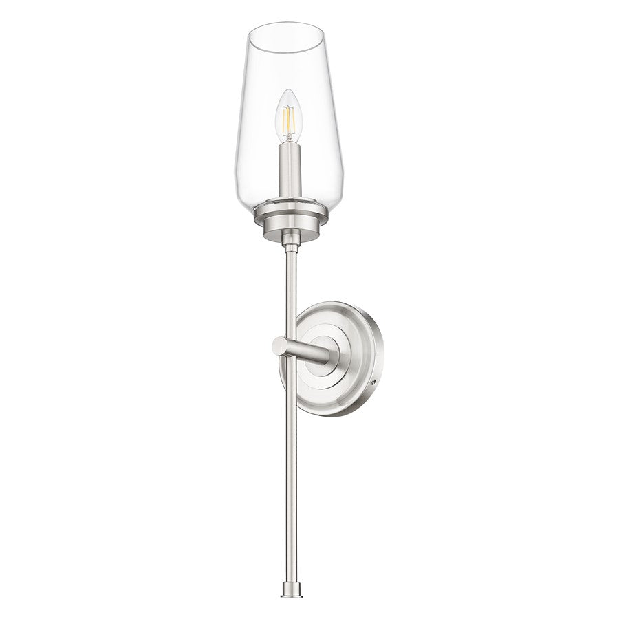 The timeless elegance of a tall, tapered glass bowl shade captures attention on this transitional one-light wall sconce. Beautiful in clean, refined decor, it features a single candelabra light and a long, slim stem that creates the illusion of a beautiful wine goblet. Its brushed nickel finish is subtle and sophisticated, perfect for living areas, bedrooms, and baths.