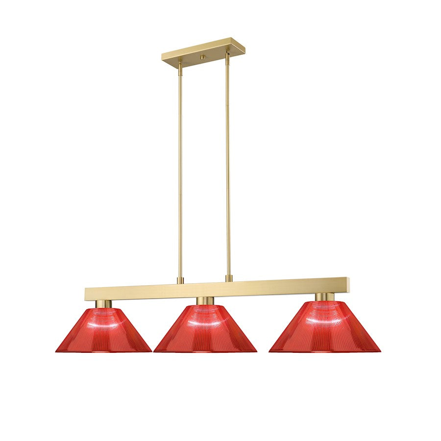 Elevate your game play with a modern three-light billiard light from the Cobalt collection. Its suspension framework and vertical hanging bar receive a timeless modern gold finish that's warm and inviting, perfect for lounging with the family or entertaining friends. Three lights are shaded in plastic with a rich burgundy finish, offering soft, diffused illumination perfect for myriad games and activities.