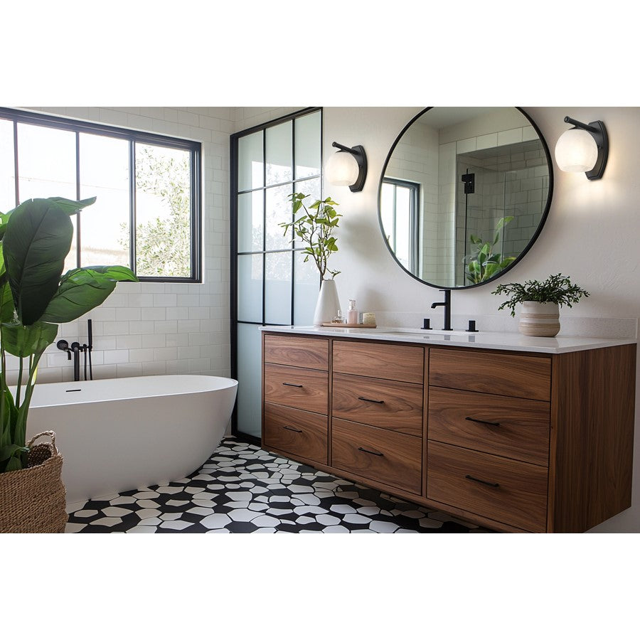 Graceful curves perfectly enhance the sweeping elegance of a transitional one-light bathroom vanity wall sconce. In black, it features a curved wall plate and rounded shade, complete with a feathered opaque white swirl pattern that diffuses illumination. It's the perfect choice for an en suite or powder room, offering bright illumination and timeless style.
