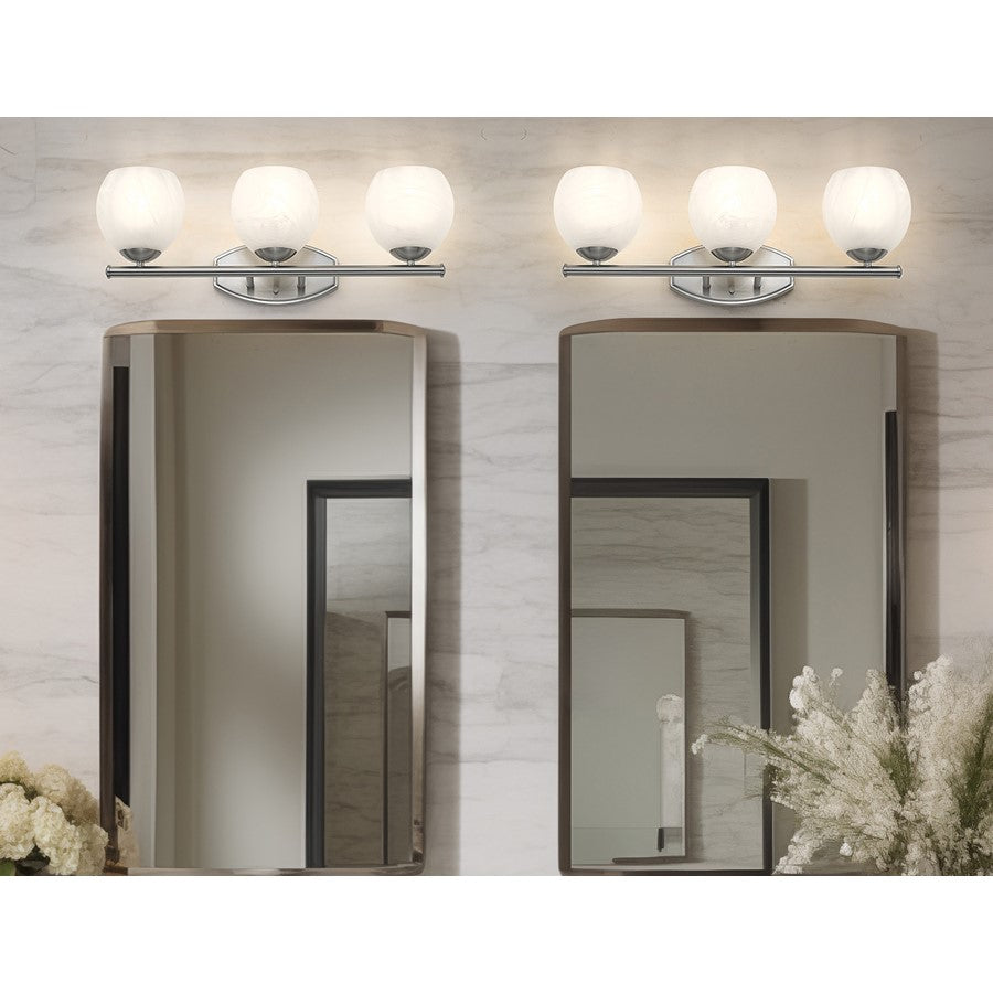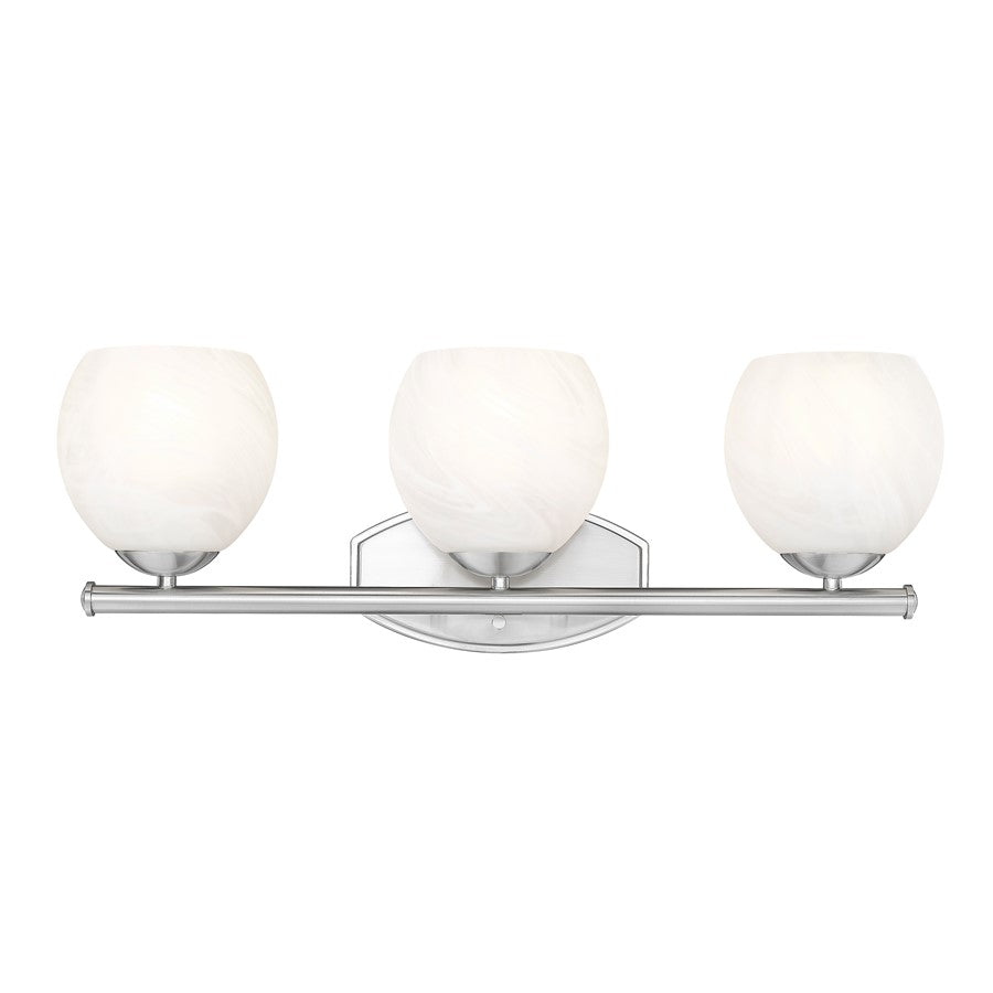 Bright illumination radiates from the trio of feathered opaque white swirl glass shades perched on this transitional three-light vanity bath fixture. An impeccable addition over your countertop, it features a brushed nickel finish that lends timeless elegance. Graceful curves define its wall plate, while a straight bar is clean and precise for a crisp, engaging look that elevates without overwhelming.