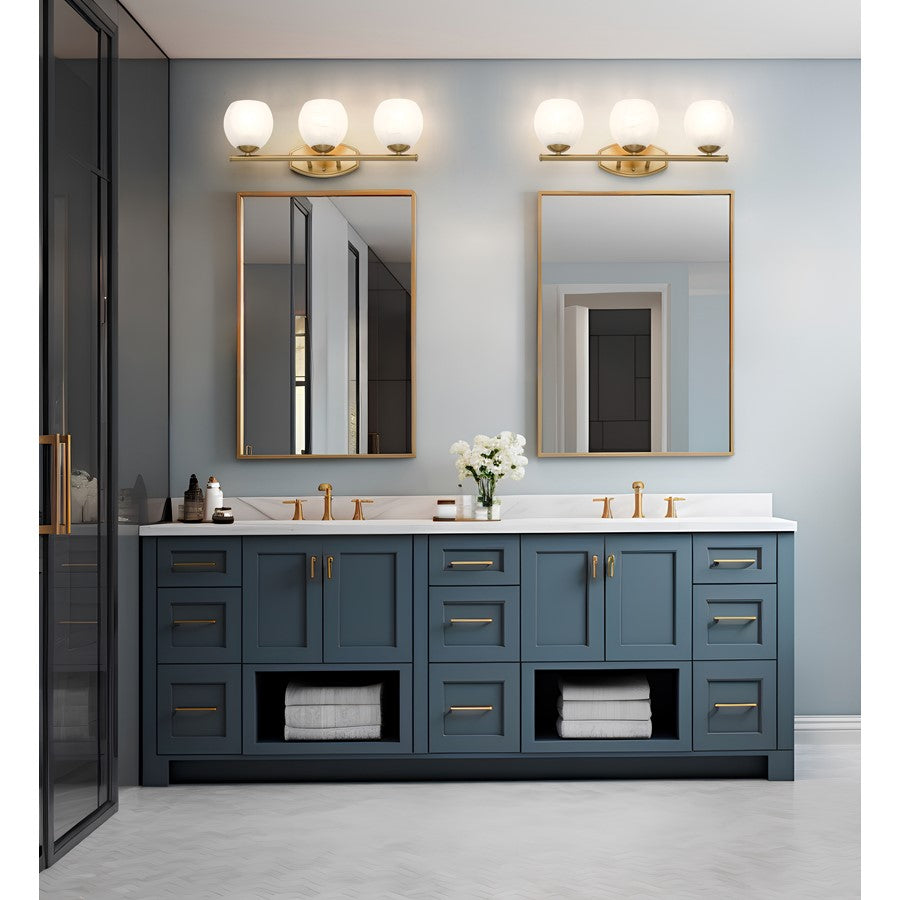 Blending a rich modern gold frame finish and white glass, this striking transitional three-light vanity bath fixture is the perfect upgrade for your space. Its three rounded shades feature a feathered opaque white swirl that delicately diffuses illumination so it's never harsh and always flattering. The clean lines and graceful curves of its frame complete the look with timeless elegance that never goes out of style.