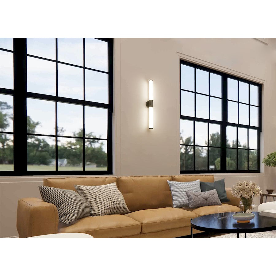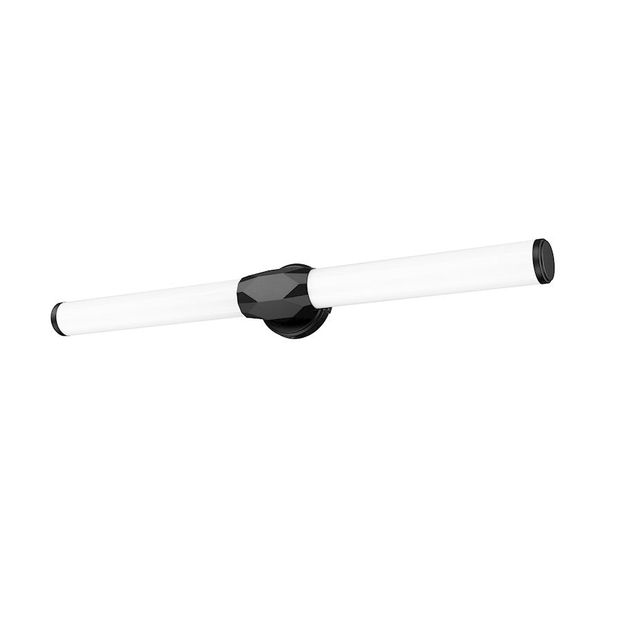 A dramatic finish and cool Art Deco inspiration repurposes industrial-modern styling in this one-light vanity light. Aluminum framing with a bold matte black finish includes end caps and a prism-inspired holder, furthering the rich geometric and complete package of a light fixture with optional color temperature values.