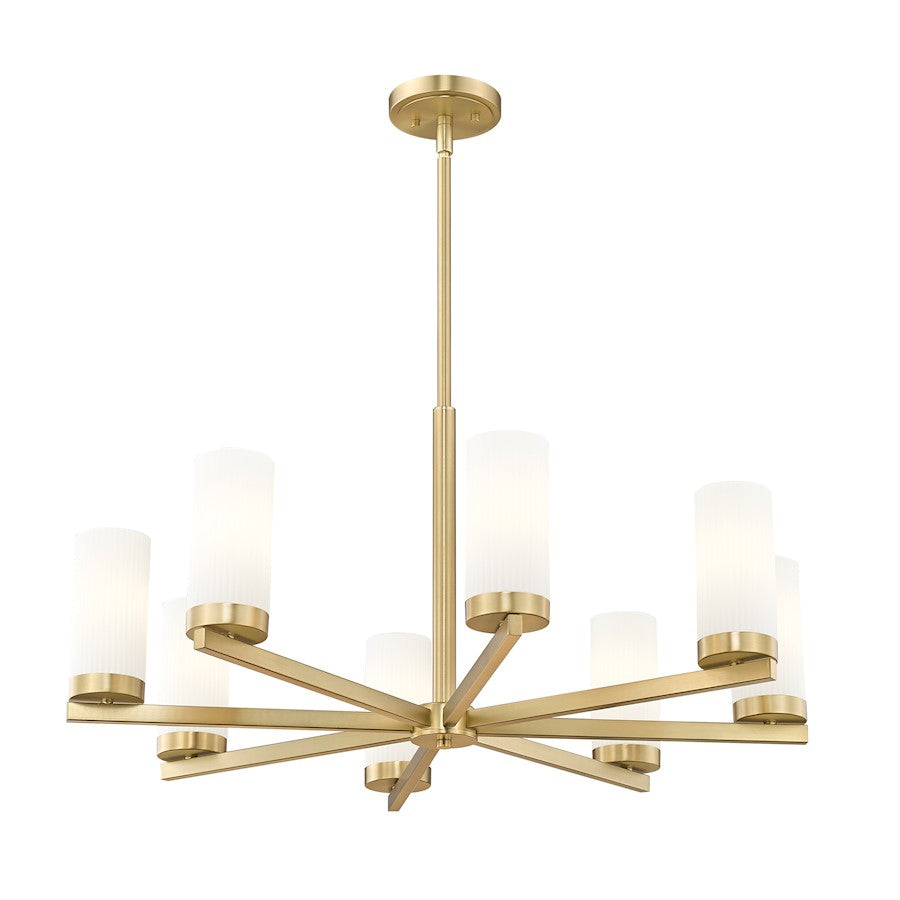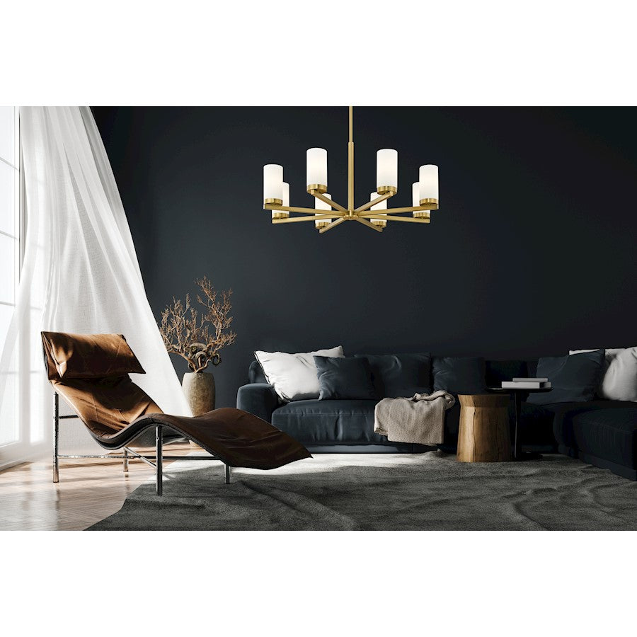 Set a soothing but sophisticated tone over your entry or dining table with a modern eight-light chandelier with a round silhouette and radial arms. It casts beautiful illumination with cylindrical shades in frosted white glass, offering a sense of balance against a warm modern gold finish over steel construction.
