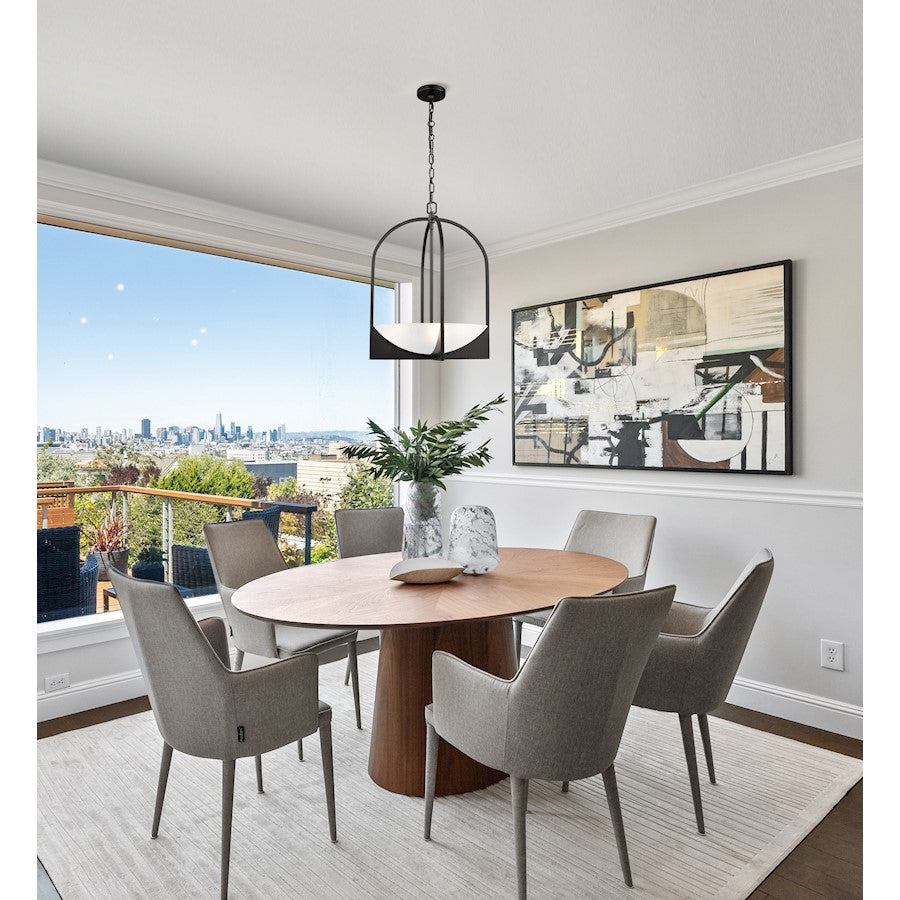 A cool sand-blast matte black finish offers a stylish touch to this four-light pendant light with an open version of sculptural artisan aesthetics. An elliptical frame contains a glam-inspired waterglass bowl acting as a subtle diffuser, diminishing glare and creating soft lighting for foyers, dining spaces, bedrooms, and hallways. This fixture is a perfect mix of contemporary and transitional design aesthetics.