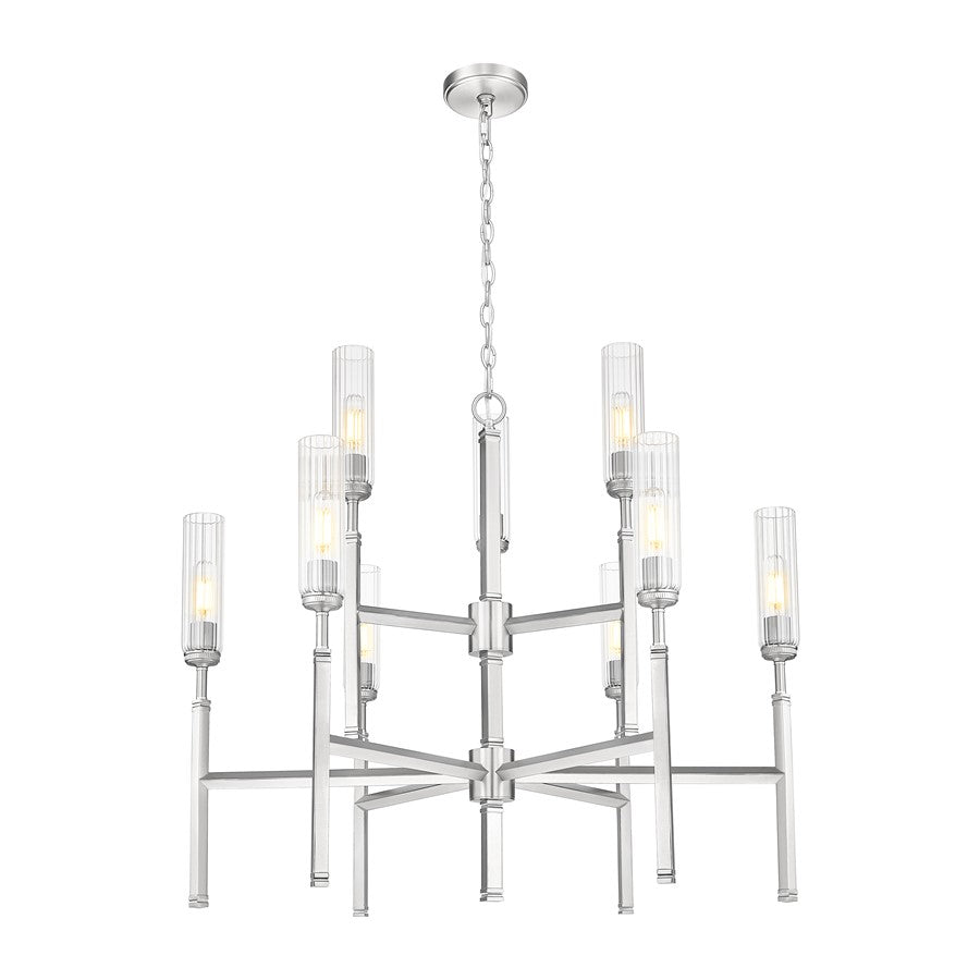 - The Esme collection offers plenty of light in a compact silhouette. The slim, fluted clear glass shades help deflect glare while providing an elegant aesthetic. Available as single or double-arm wall sconces with a diamond-shaped backplate or in 5-, 6-, and two-tier 6+3-light configurations, the shades are deliberately staggered to provide a visually interesting look that also maximizes the light output without taking up a lot of space. The finish choices are Brushed Nickel, Matte Black, or Modern Gold.