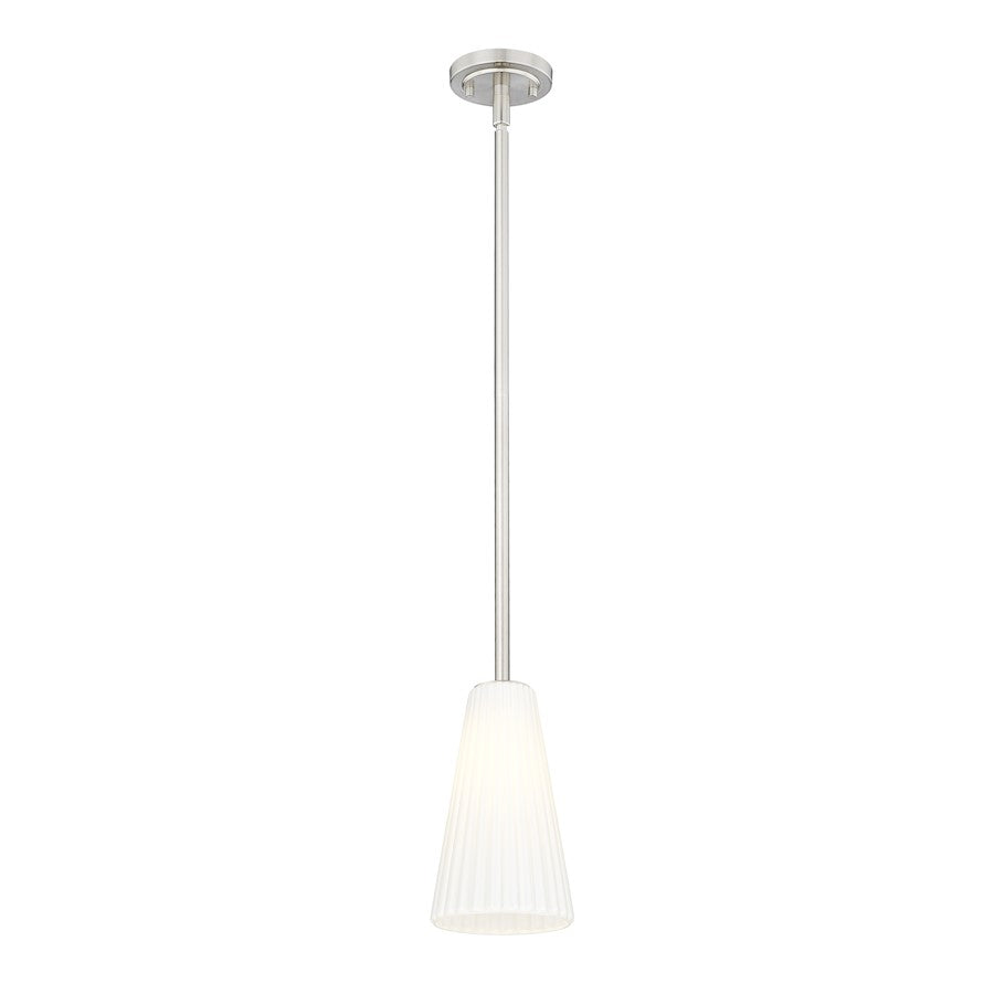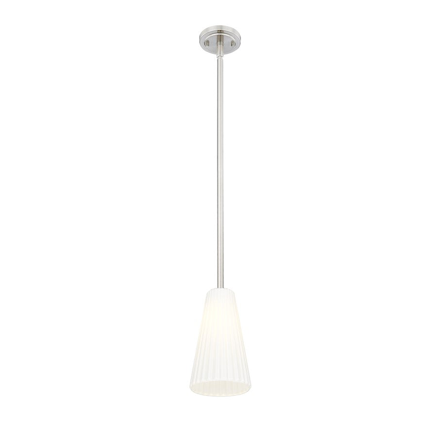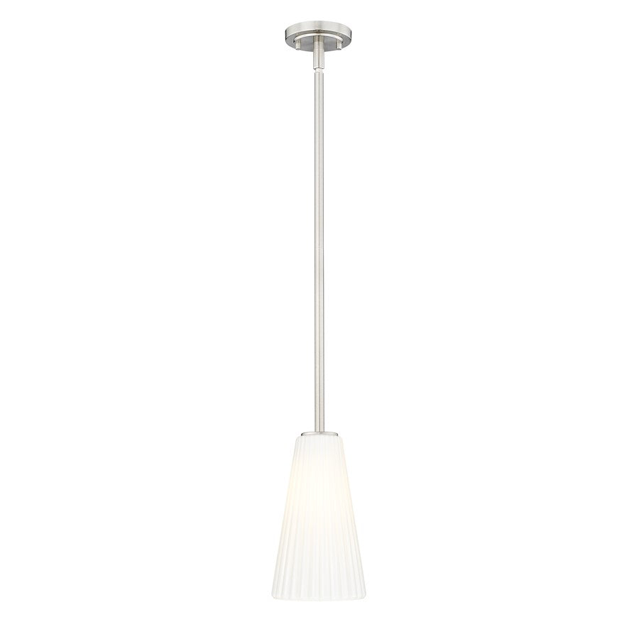 Radiant sophistication emanates from a modern one-light pendant. It pairs an elongated silhouette with a smooth, refined brushed nickel finish, capped with a delicately fluted white glass shade. Timeless and refined, this pendant delivers fresh style to your living space or bedroom, instantly elevating the surrounding decor.