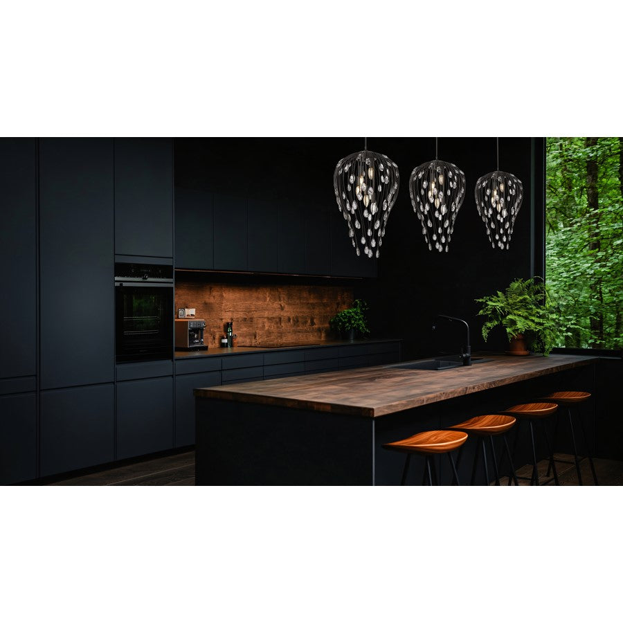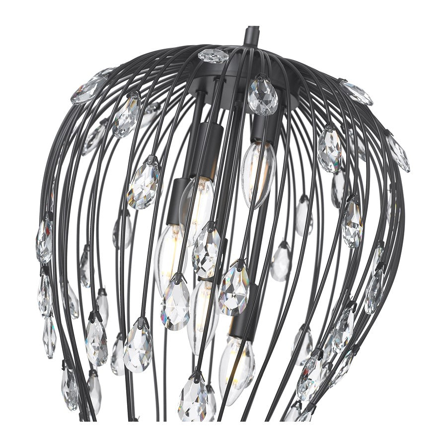 Delicacy and elegance merge to offer a luxe look in this five-light metal pendant light, an exquisite light source for a host of venues. Open metalwork with a bold matte black finish forms organic inspiration with curved silhouetting and emulations of slender twigs, as sparkling crystal elements add a bud-like look. Sparkling beauty offers ambient lighting perfect for dining rooms, living rooms, and foyers.