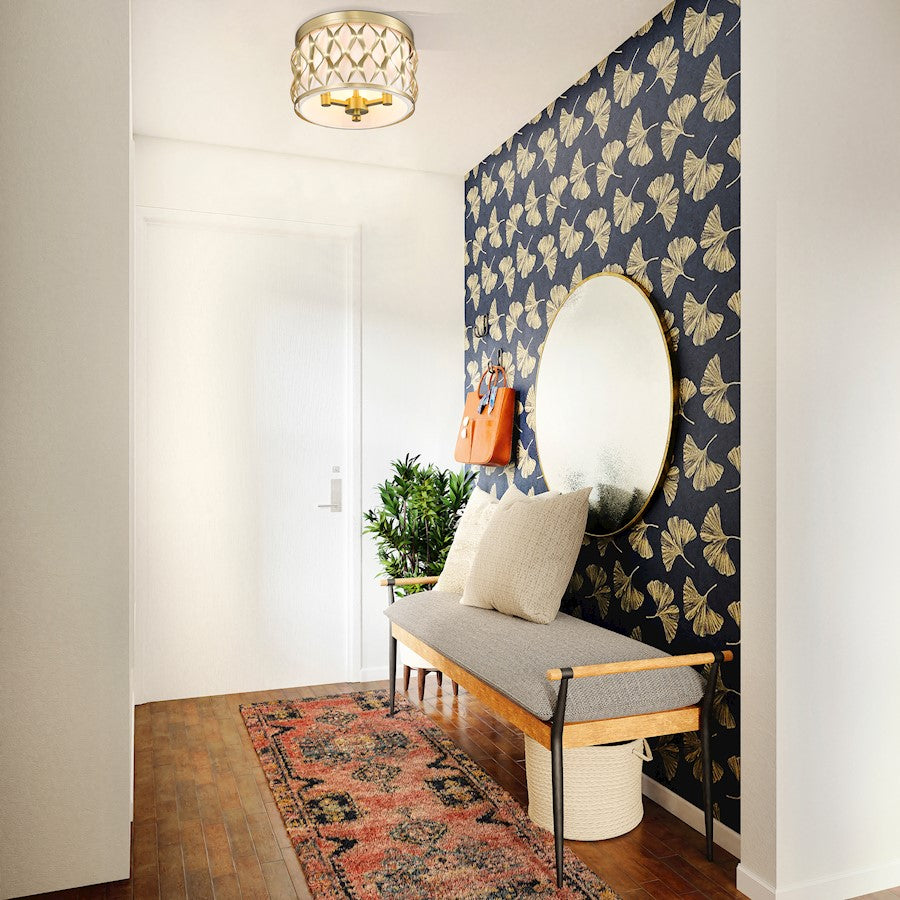 A drum silhouette is crisp and stylish as it enhances this three-light flush mount ceiling light with a timeless metal frame. Ride the vertical waves aligned perfectly around its modern gold finish steel frame, and bask in the soft glow of illumination filtered through a white fabric diffuser that eases harsh glare. This dimmable ceiling light offers artistry that becomes a focal point in a kitchen, foyer, or living room.