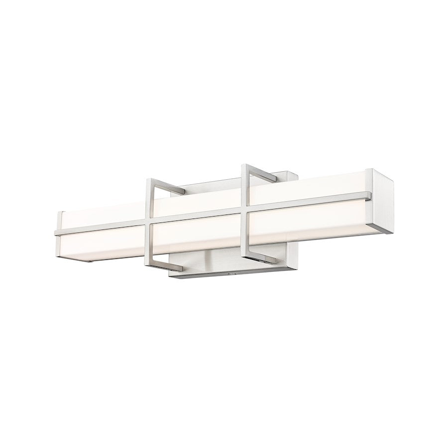 An intricately crafted bracket creates an elegant hint of industrial character for a modern one-light LED vanity light. In brushed nickel with a frosted diffuser, it's a linear design complete with vertical and horizontal elements that create contrast and depth. Bright, dimmable illumination shines through the frosted shade, creating soft, true lighting perfect for grooming and ambiance.