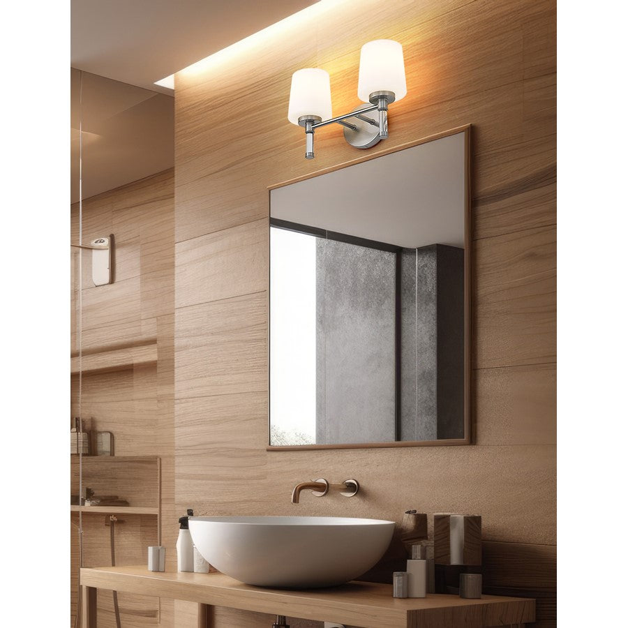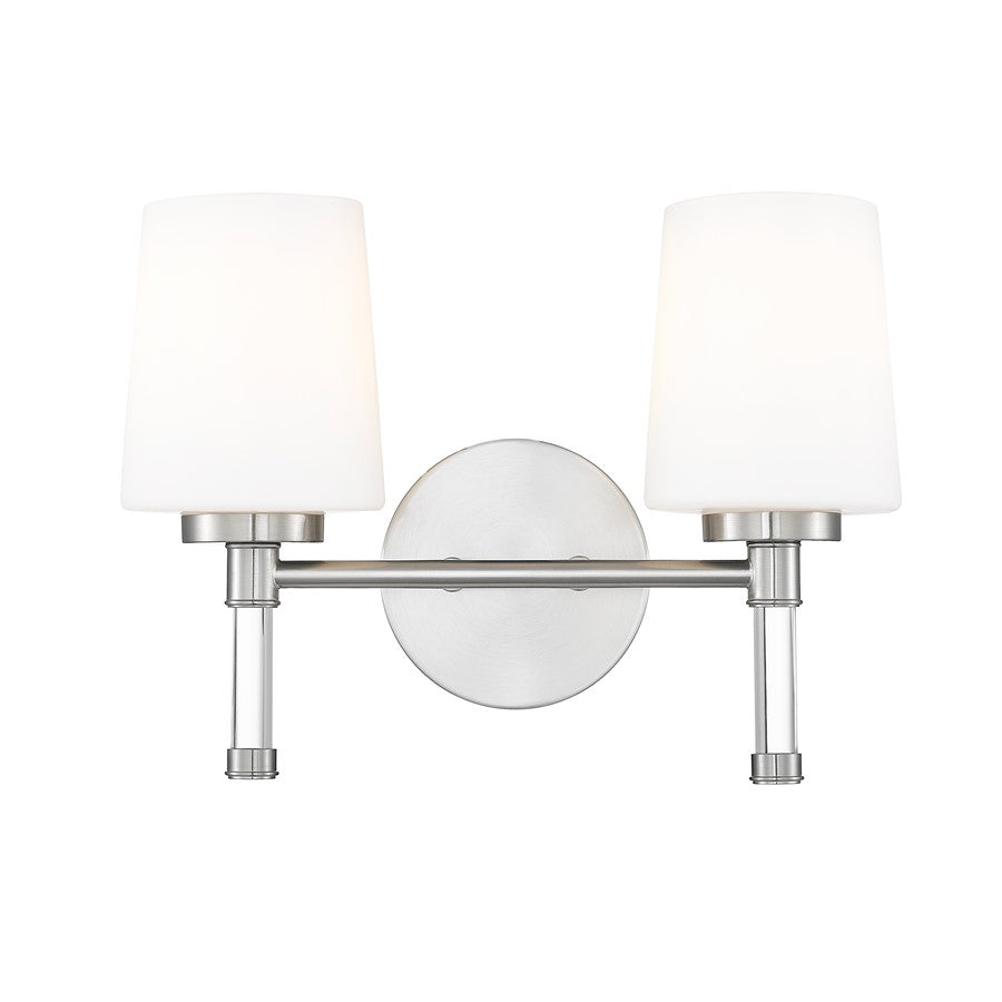 Stretching gracefully across the wall, this brushed nickel two-light vanity light brings twin opal shades that balance a wider mirror and keep both sides of the sink evenly illuminated. The crisp metal bar and delicate crystal accents create a look that feels at once tailored and airy, making it just as at home in a shared family bath as in a refined primary suite. Dim the bulbs for a relaxed spa-like soak or turn them up for energizing morning light, and this adaptable piece supports every mood the room needs to hold.
