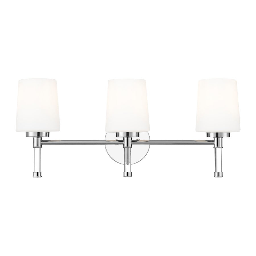 Gleaming metal gives this chrome three-light vanity light a sleek, mirrored presence that bounces reflections around the room and instantly sharpens the vanity area. Crystal accents beneath each shade catch the light, while the opal glass keeps that brightness gentle enough for relaxed evening wind downs. Over a wide sink or floating vanity, this radiant fixture links faucets, hardware, and framed mirrors into one cohesive, urbane scene.