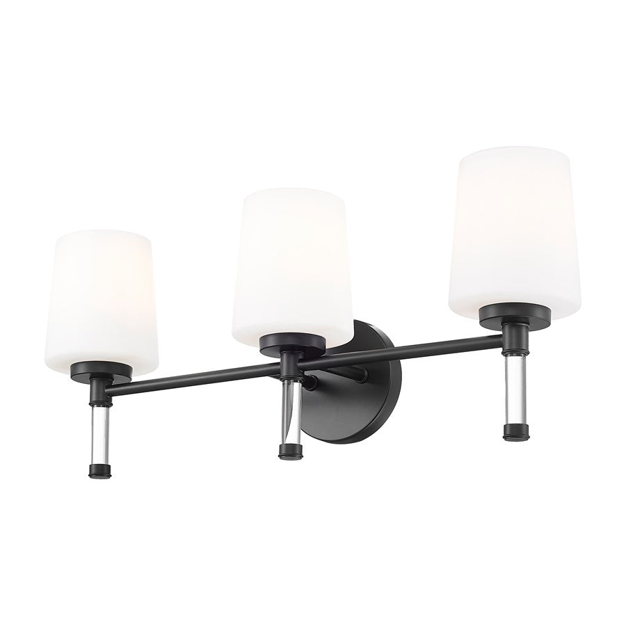 With its deep, inky finish, this matte black three-light vanity light creates a strong outline against pale walls and stone, giving the vanity wall a confident sense of structure. The trio of opal shades appears to hover on clear stems, so the overall look stays light and airy even as the fixture delivers plenty of brightness for detailed grooming. Perfect for a modern farmhouse bath or a city loft, this design introduces just enough drama to make everyday routines feel a bit more elegant.