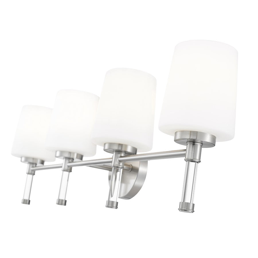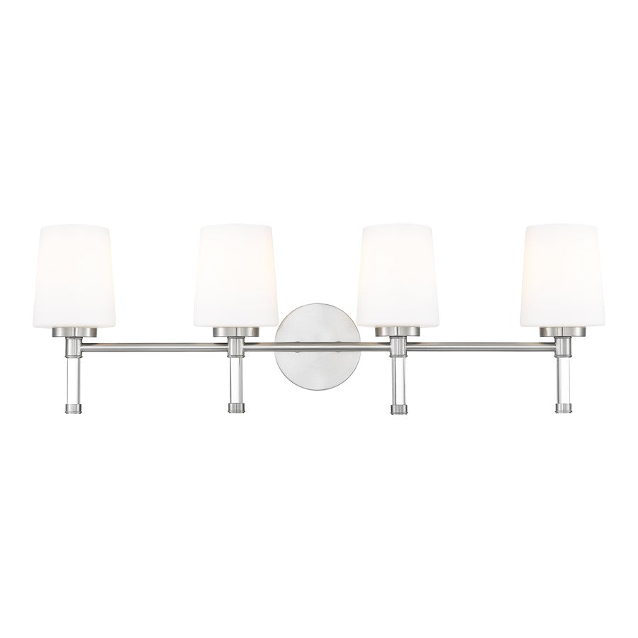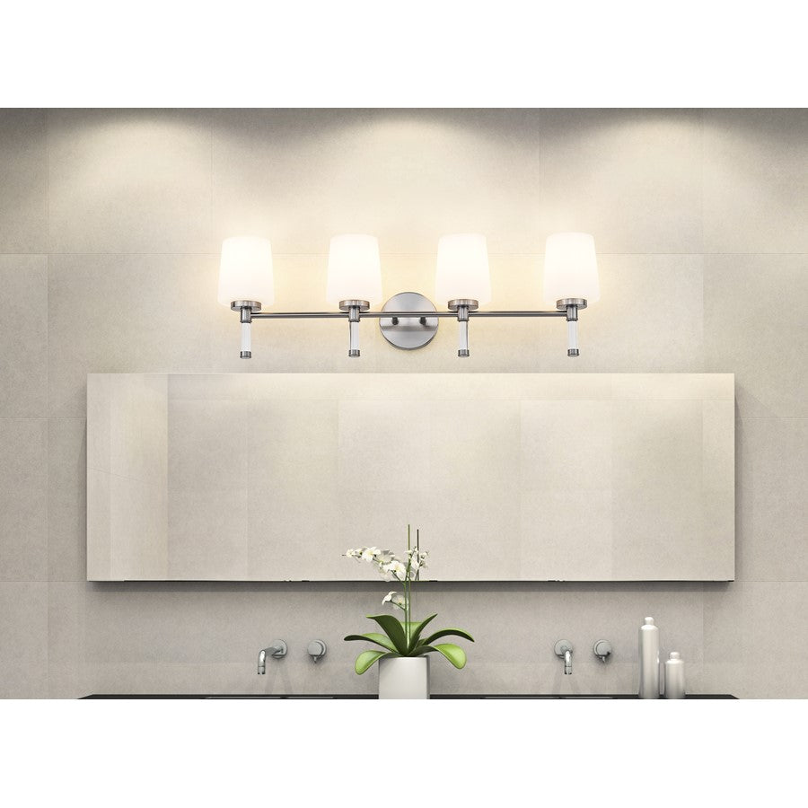 Designed for wider counters and shared spaces, this brushed nickel four-light vanity light spans the wall with an easy, horizontal line that feels calm and organized. Four opal glass shades send out generous, even illumination that helps every corner of the mirror come alive, from the farthest edge of a double sink to the center where everyone gathers. In a busy household bath or a serene primary retreat, this dependable fixture acts as a steady anchor that keeps the room feeling bright and thoughtfully finished.