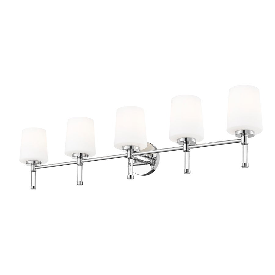 A sweep of gleaming chrome and five glowing shades brings a touch of penthouse glamour to even a simple bath. Because this chrome five-light vanity light reflects tile, mirror, and hardware all at once, it turns the vanity wall into a lively focal point that sparkles during busy mornings and softens beautifully when dimmed at night.