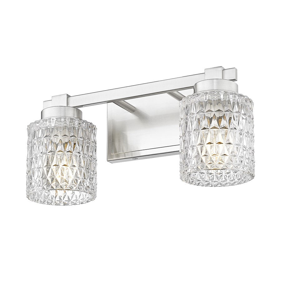 Crystal cut diamond patterning adds a textural quality to shades of this two-light vanity light, a decadent addition to bathrooms and outer living spaces. Timeless style features subtle detail on a brushed nickel finish steel frame, offering versatility and timeless design elements. Dim lighting to suit custom needs or create mood illumination.