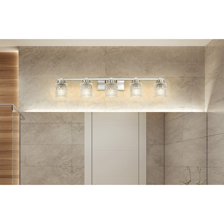Texture and artistry team up to produce tasteful glam in a five-light vanity fixture perfect for larger master and guest bath settings. You'll love the subtle yet sophisticated detailing on its brushed nickel finish steel framing, with textural clear glass shades showing off precision diamond patterning. This dimmable light fixture blends aesthetics with function to suit the needs of custom living areas.