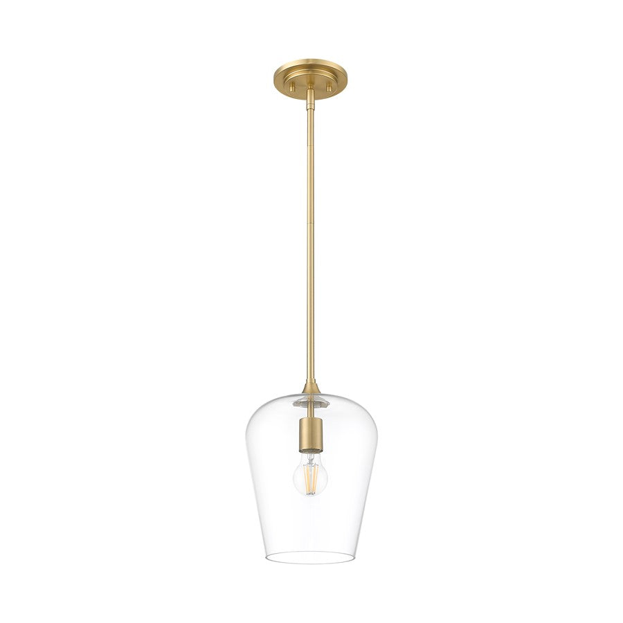Soft artistry reflects in this single-light fixture blending metal and glass and offering a tasteful and timeless motif. Beautiful burnished brass finish steel framing and an inverted clear glass shade create simple silhouette with tons of elegance and versatility, as dimming features add important customization of high-level or low-level lighting.