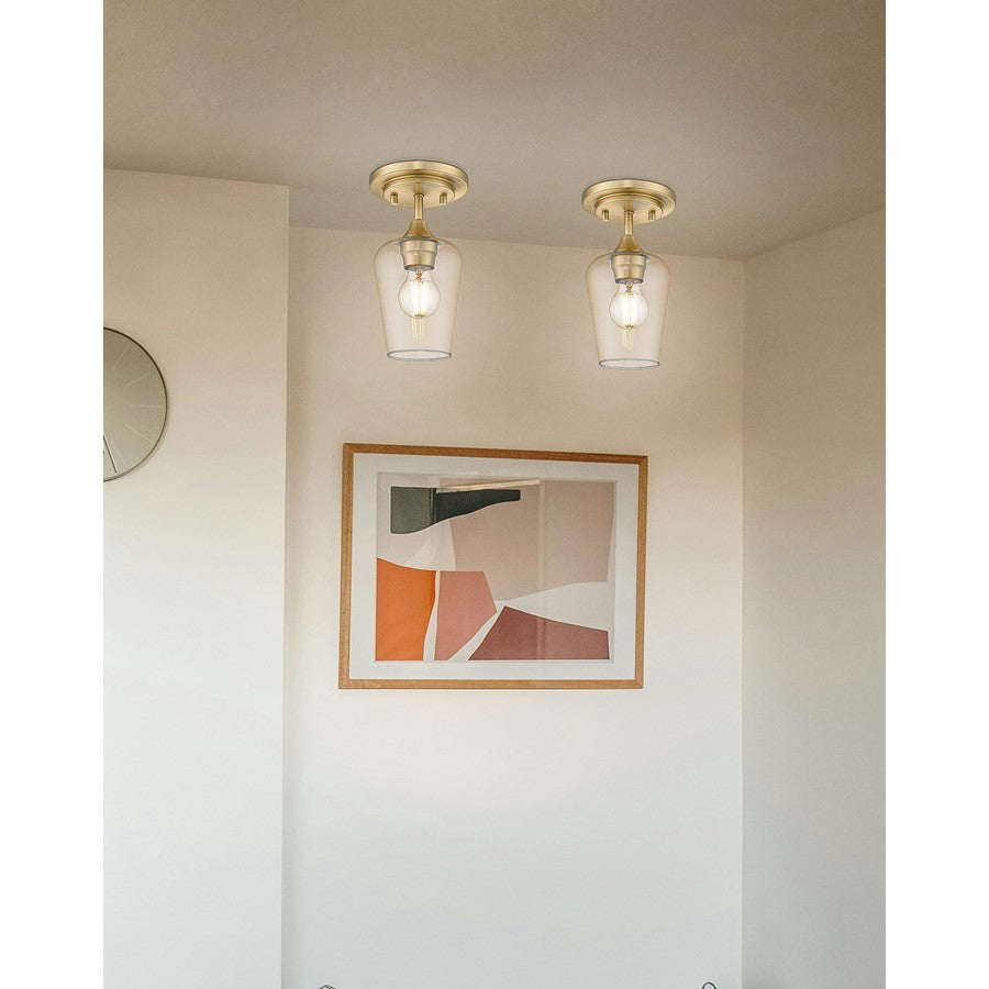 Tempting delicacy offers a single-light flush mount ceiling light attracting admiration from floor to ceiling. An inverted clear glass goblet shade filters soft, dimmable illumination as it contributes to a truly artisan craftsman motif. Subtle accents on its burnished brass finish steel framing lift a dramatic motif perfect for modern or transitional bathrooms, bedrooms, kitchens, and dining spaces.