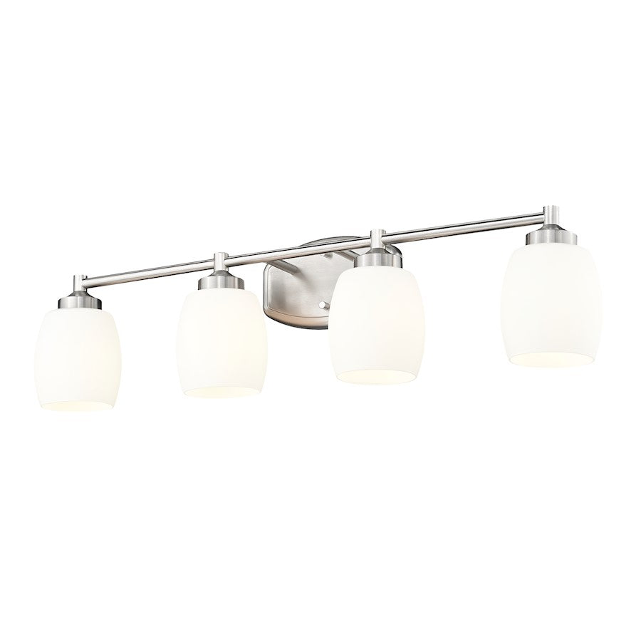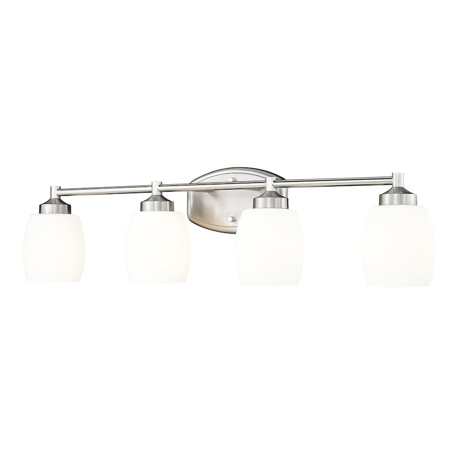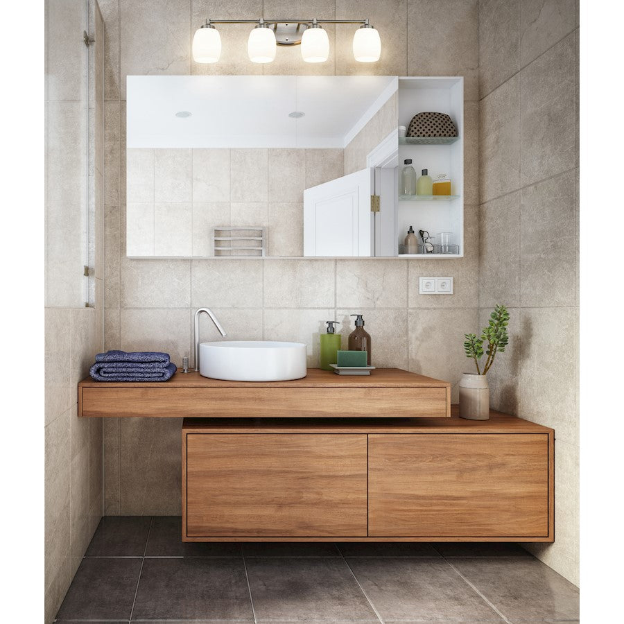 From the Kendrick collection, this modern four-light vanity fixture is a soothing choice that highlights organic curves in a compelling composition. Perfect for a generous counter space, it delivers a sleek silhouette with a brushed nickel finish that gleams in the light. Matte opal glass shades echo the rounded shape of the wall plate while assuring soft, but bright illumination for all your morning and evening rituals.