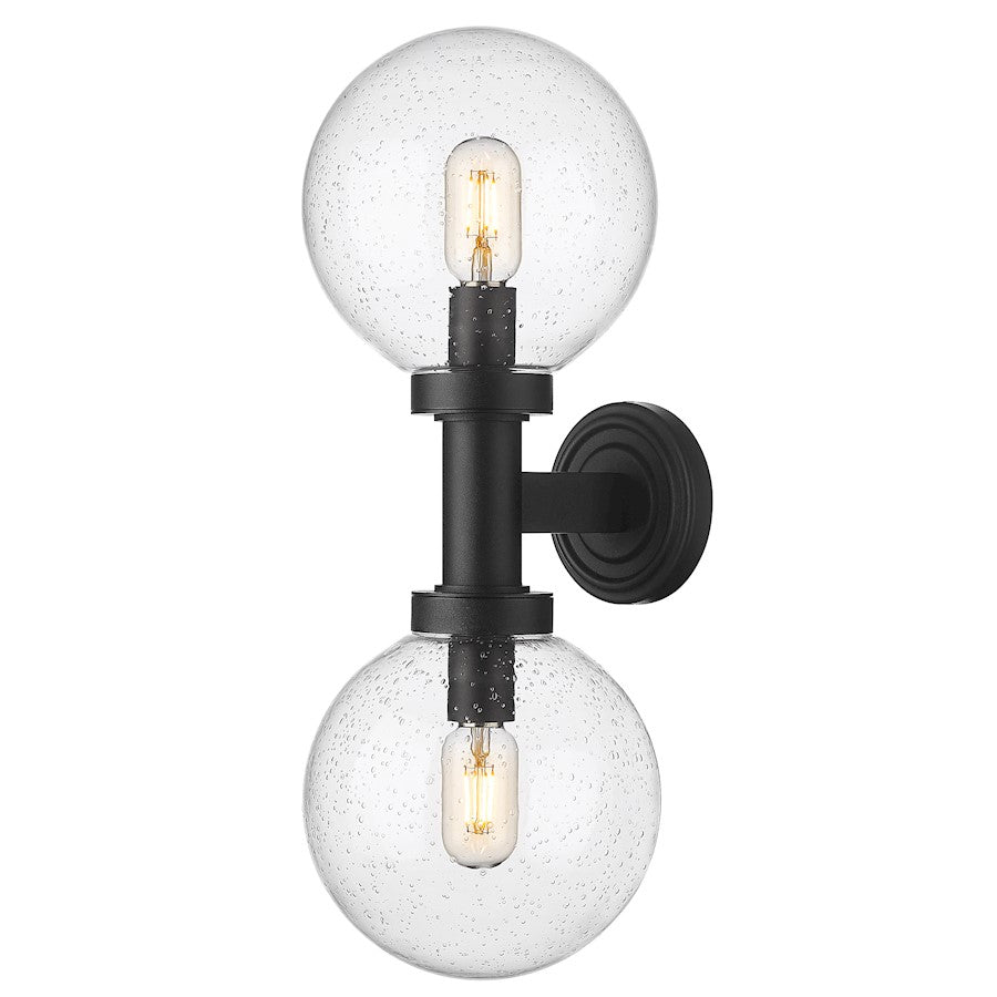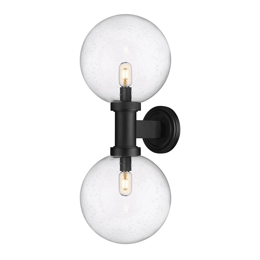 Lighting plays into a décor scheme focused on sheer style. From the Laurent collection comes a two-light outdoor wall sconce with a linear and circular blend of silhouetting. A simple yet tasteful black finish aluminum frame and wall plate hosts dual globe shades fashioned of delicate clear seedy glass.Backplate Dimensions: 4.75" W x 4.75" H Backplate Dimensions: 6.625" W x 6.625" H