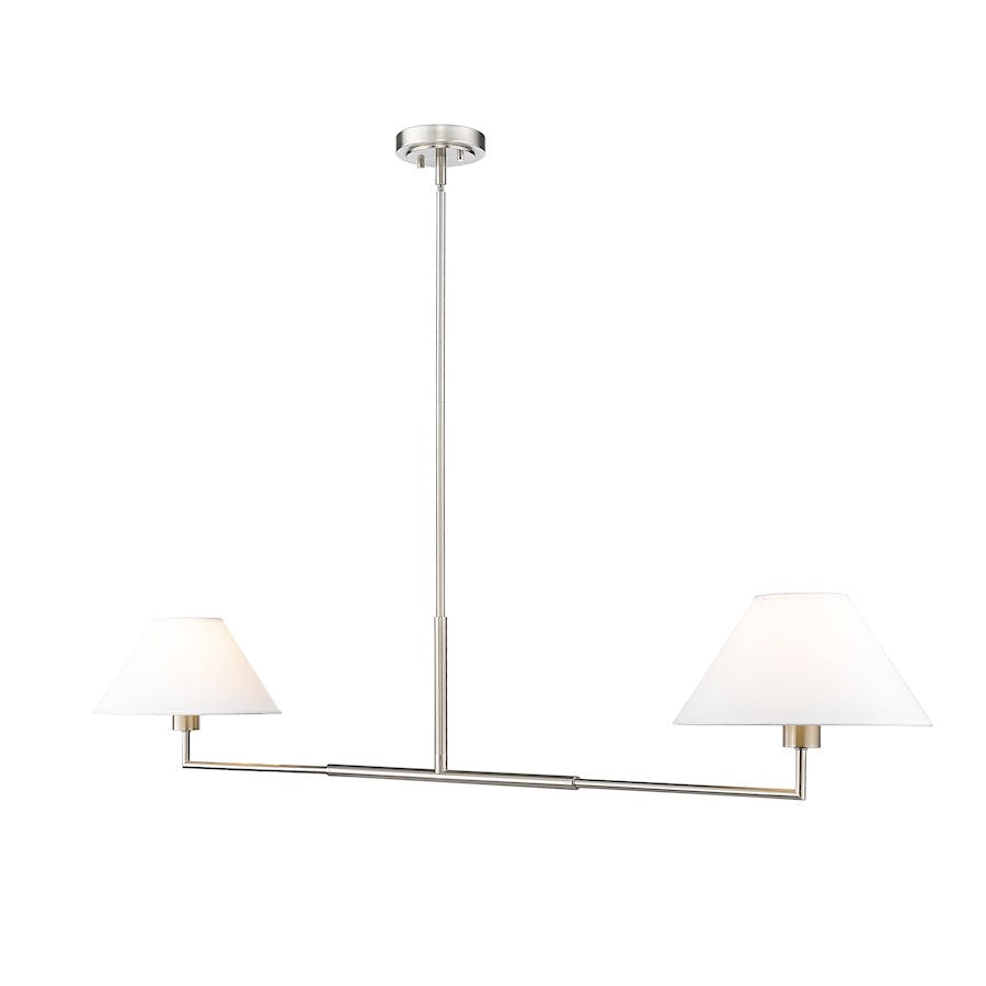 Highlighting modern simplicity and elegance, this chic two-light linear chandelier is stunning over a kitchen island or spanning a living room seating area. Its clean lines are accentuated with a crisp brushed nickel finish over steel construction, while a pair of white linen empire shades are beautiful and timeless in any room. Casting inviting illumination for tasks and ambiance, this chandelier is a stylish fit in myriad spaces.