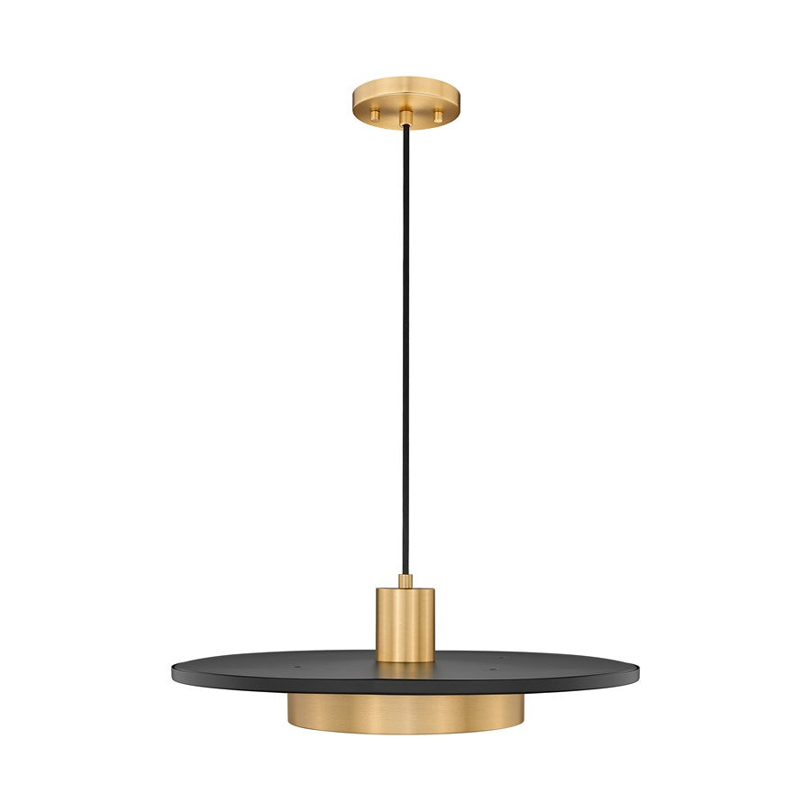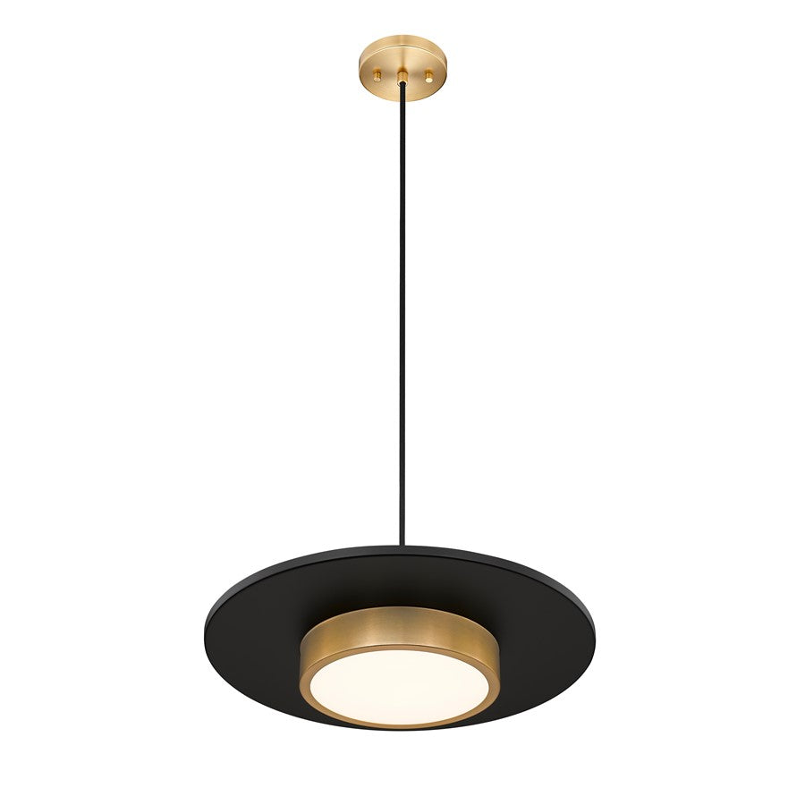 Epic, iconic style makes the most of simplicity in a one-light pendant perfect for a host of settings. Geometric shapes include cylinder elements made of modern gold finish steel construction with a centered large matte black disk creating visual separation. LED lighting through a frosted acrylic shade features dimming options to create mood lighting.