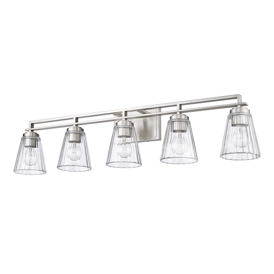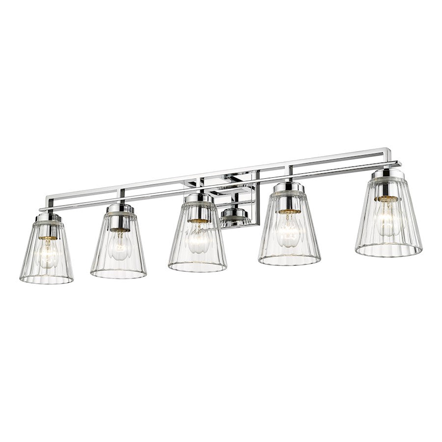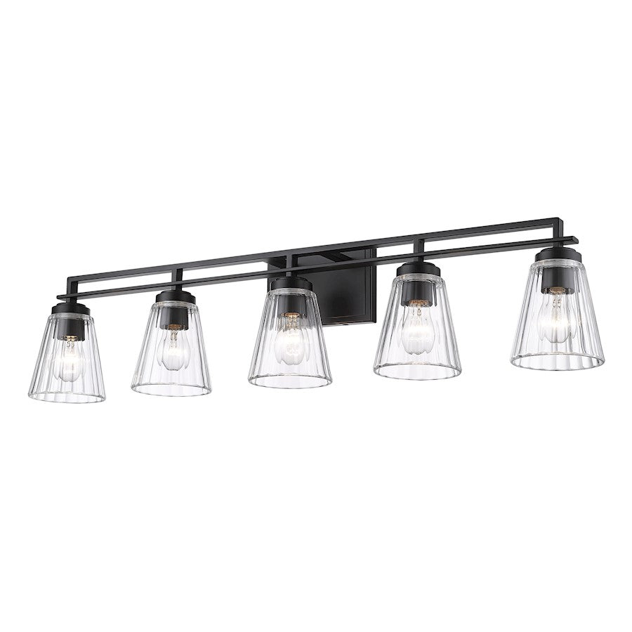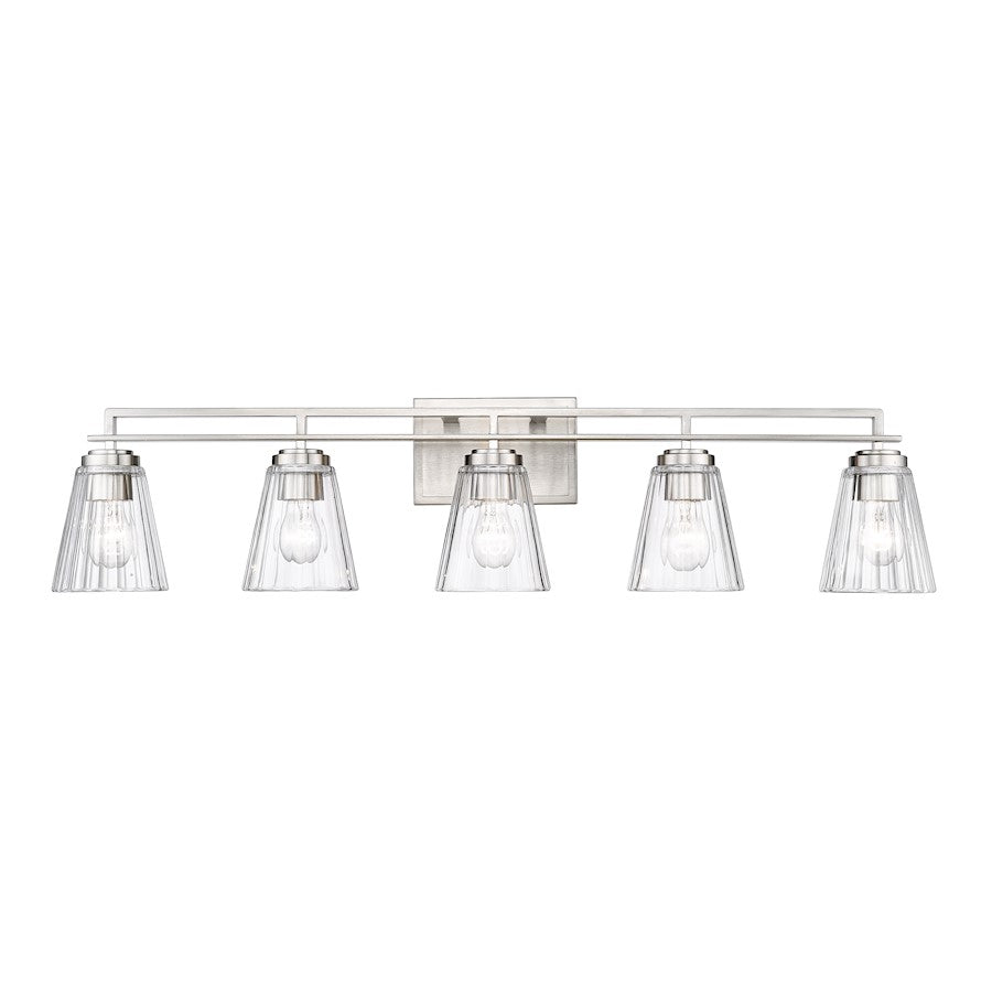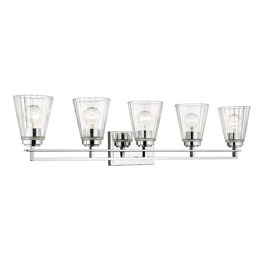 Upgrade to upscale in ensuite and guest bath spaces with this five-light vanity light from the Lyna collection. Glam elements form a fixture that becomes a focal point in contemporary bathrooms, showcasing a linear brushed nickel or chrome or matte black finish steel frame and romantic conical shades created of clear ribbed glass. Perfect for embellishing a modern or transitional bathroom with a nautical theme, this five-light vanity light delivers on a promise of elegance and sophistication.