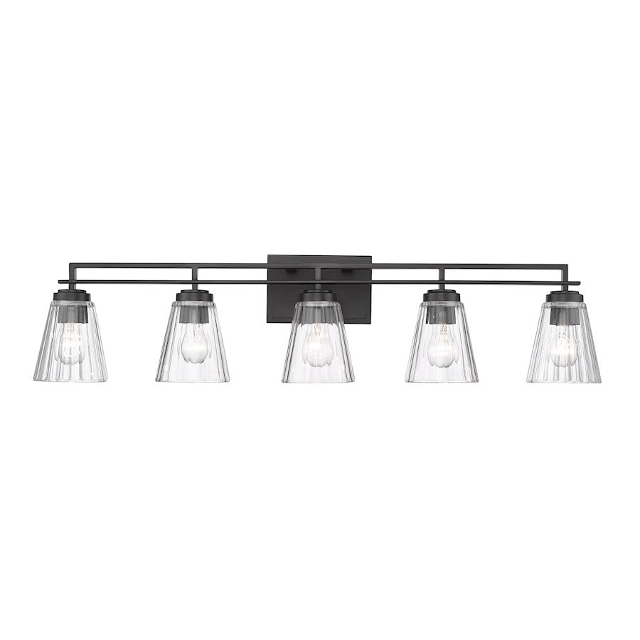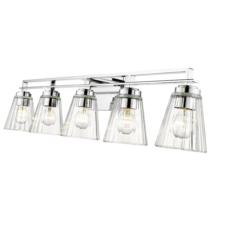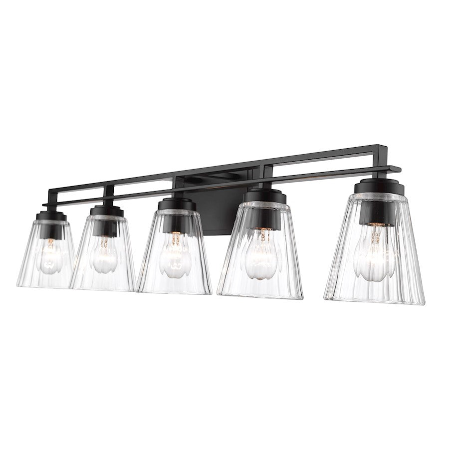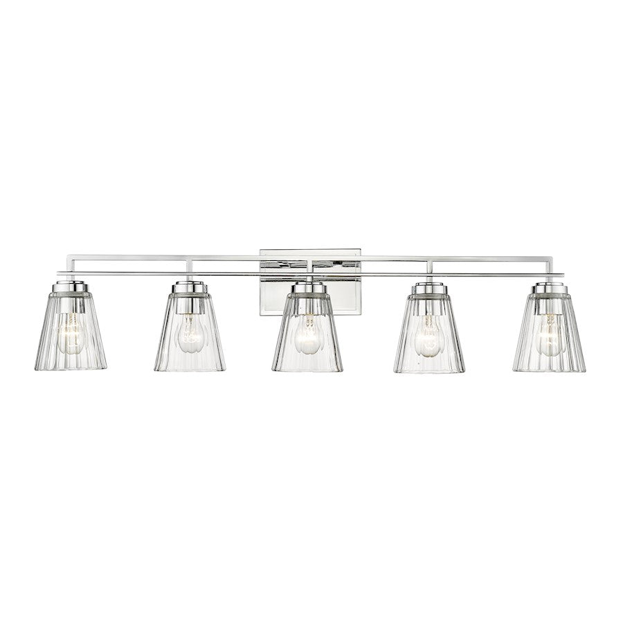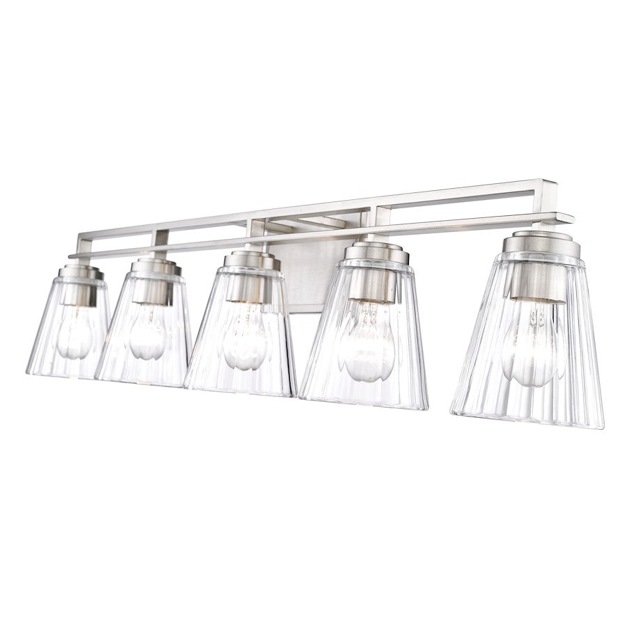 Upgrade to upscale in ensuite and guest bath spaces with this five-light vanity light from the Lyna collection. Glam elements form a fixture that becomes a focal point in contemporary bathrooms, showcasing a linear brushed nickel or chrome or matte black finish steel frame and romantic conical shades created of clear ribbed glass. Perfect for embellishing a modern or transitional bathroom with a nautical theme, this five-light vanity light delivers on a promise of elegance and sophistication.
