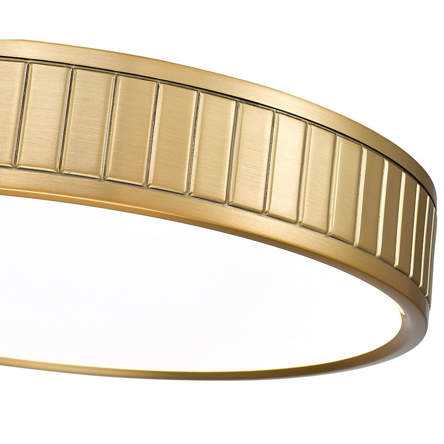 A glam modern gold finish is warm and inviting as it complements updated living spaces with a low-key aesthetic. Steel construction forms a ring canopy with vertical slats nestling a frosted acrylic diffuser that sends optional and changeable white-color values to light up a modern kitchen, dining room, or foyer.