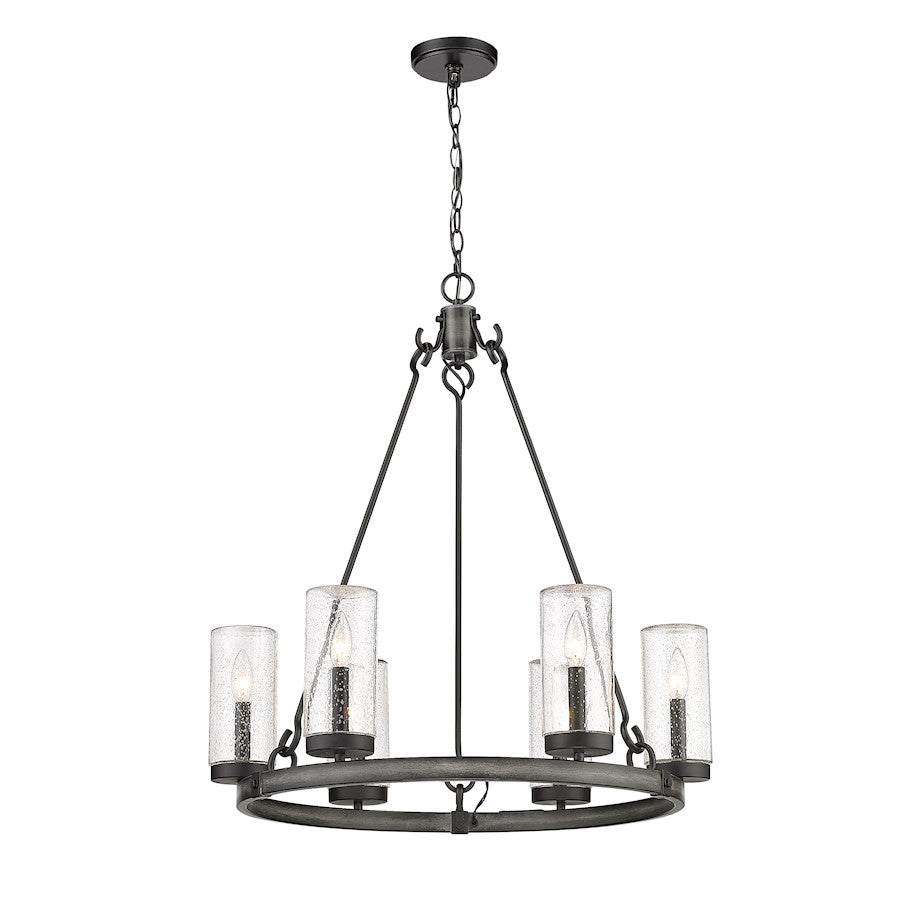 European influence guides the romantic design of the Marlow six-light outdoor pendant, creating an eye-pleasing circular silhouette perfect for a gazebo or covered patio space. Indulge in a theatrical motif with a light fixture featuring an ashen barnboard or matte black finish steel frame nestling clear seedy glass cylinder shades. Ornate, intricate detailing speaks to an effort to raise the attitude of any space.
