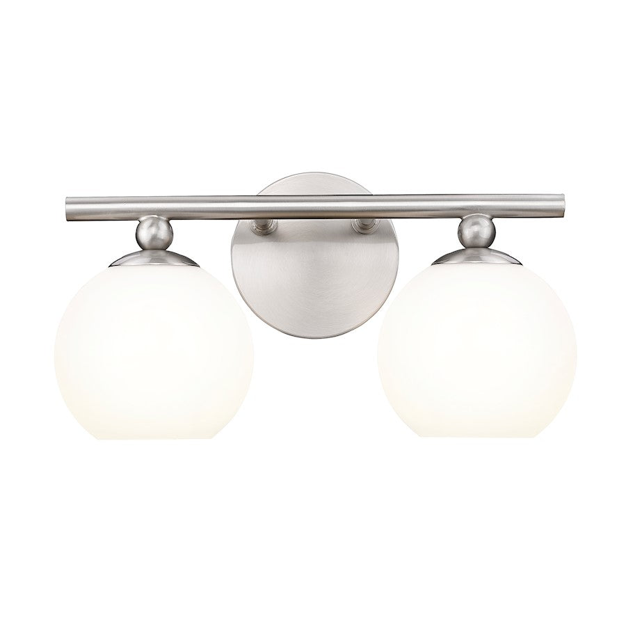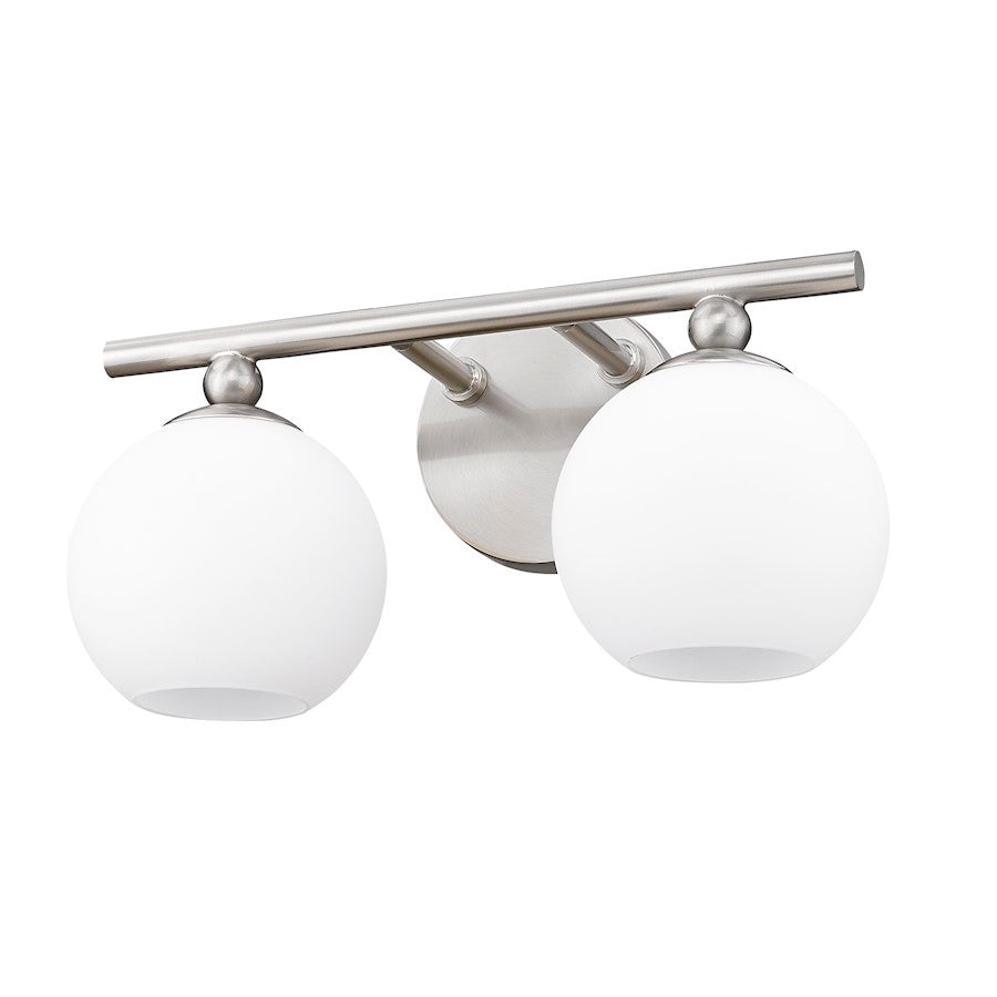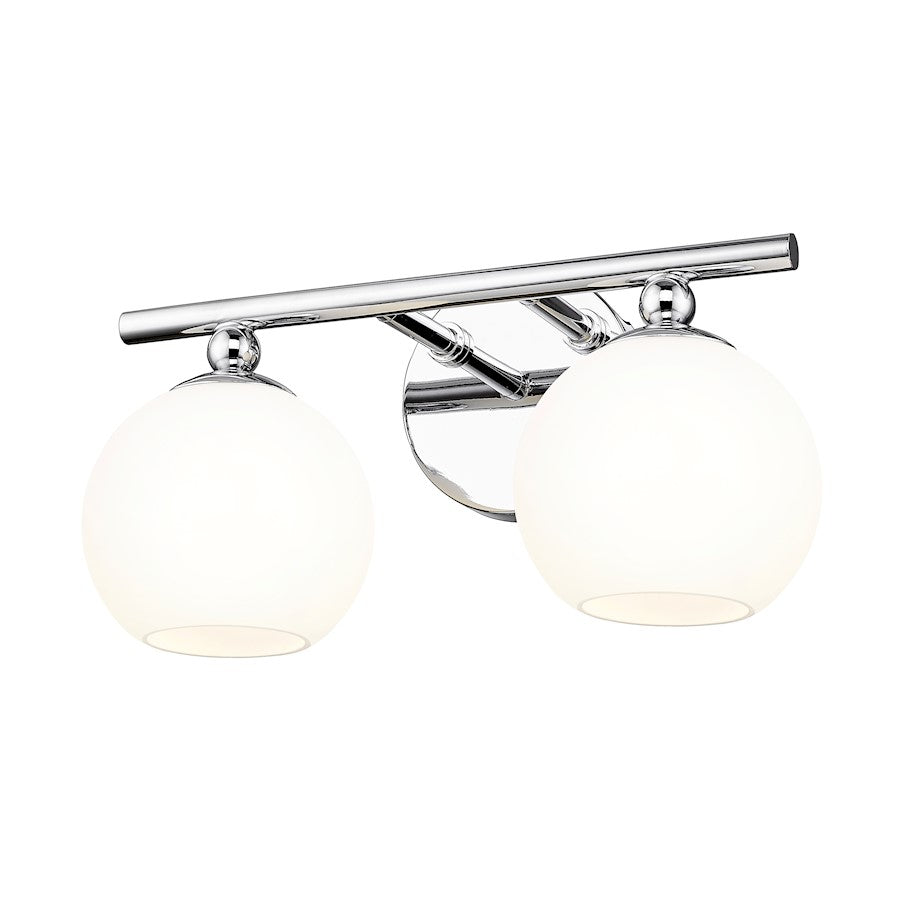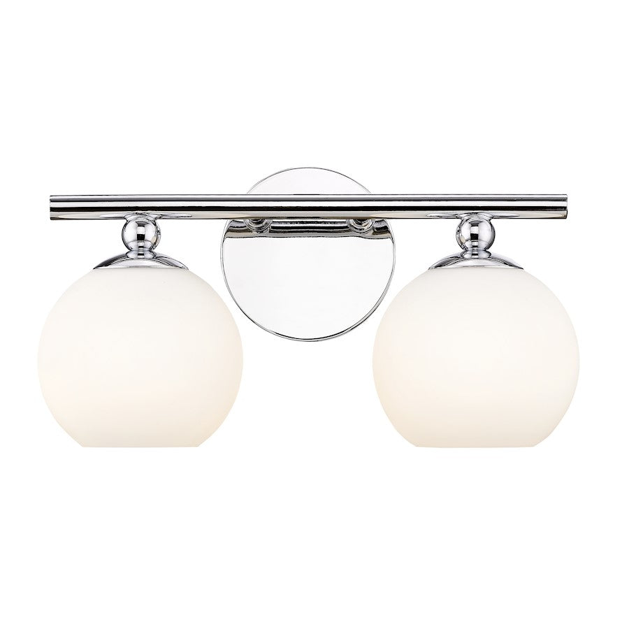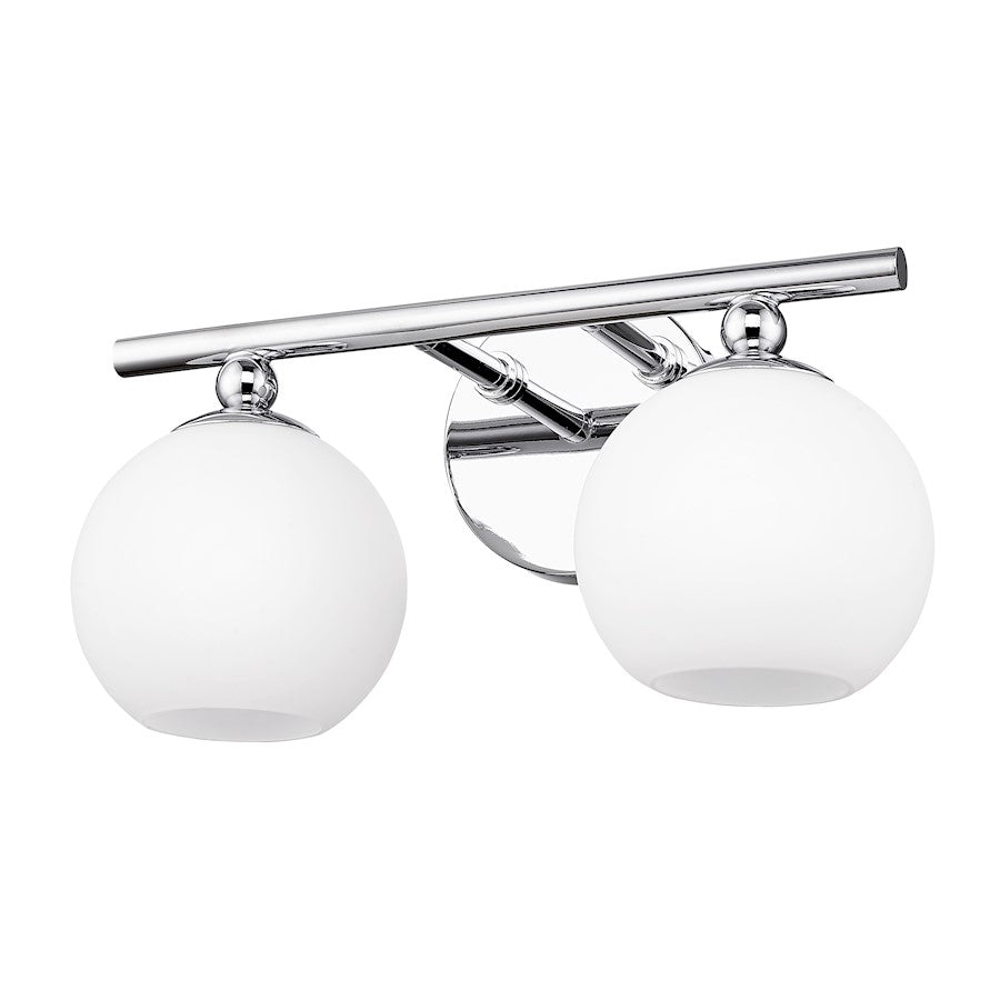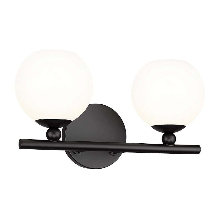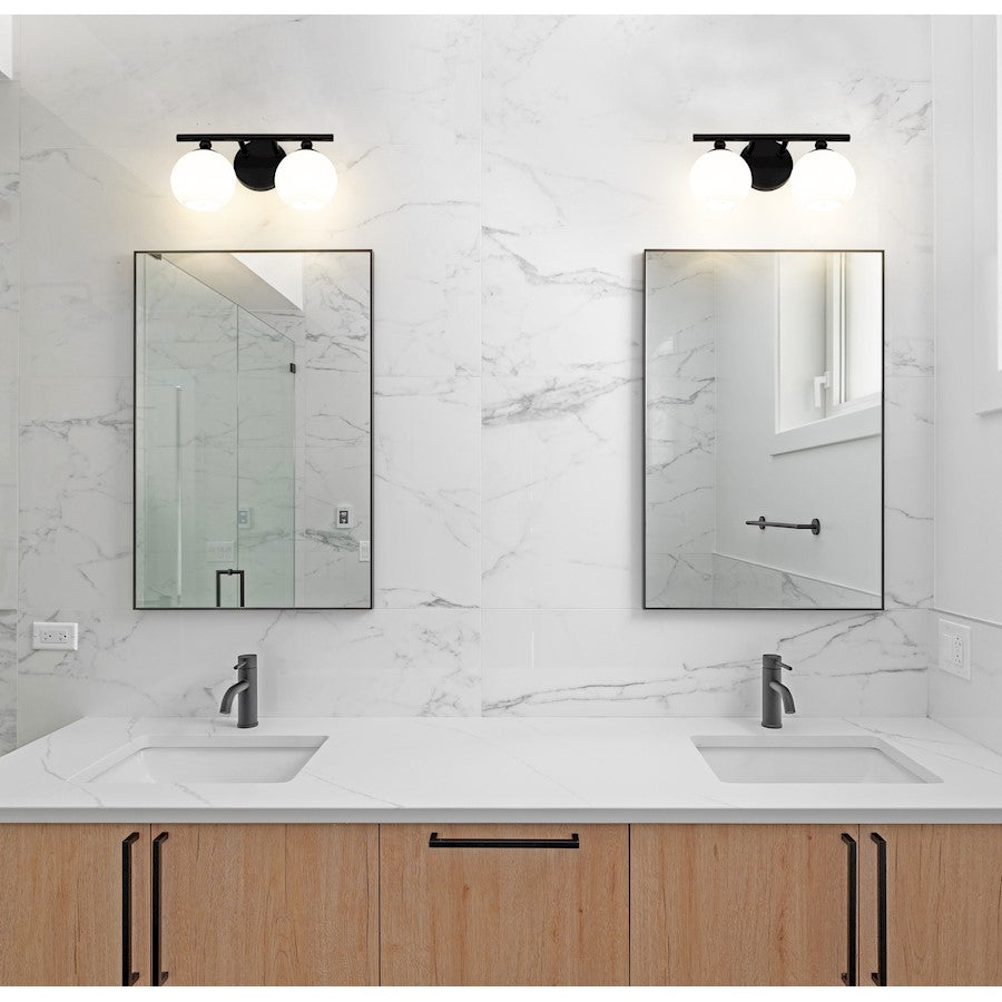 Make modern style work in an updated bath space with this two-light vanity light from the Neoma collection. Symmetry and a hint of festive retro influence blend to add an outspoken design aesthetic featuring side-by-side opal etched glass globe shades affixed to a minimalist frame made of brushed nickel or chrome or matte black or modern gold finish steel. This contemporary vanity light transforms a master ensuite or guest bath into a haven for style.