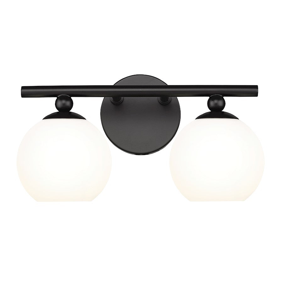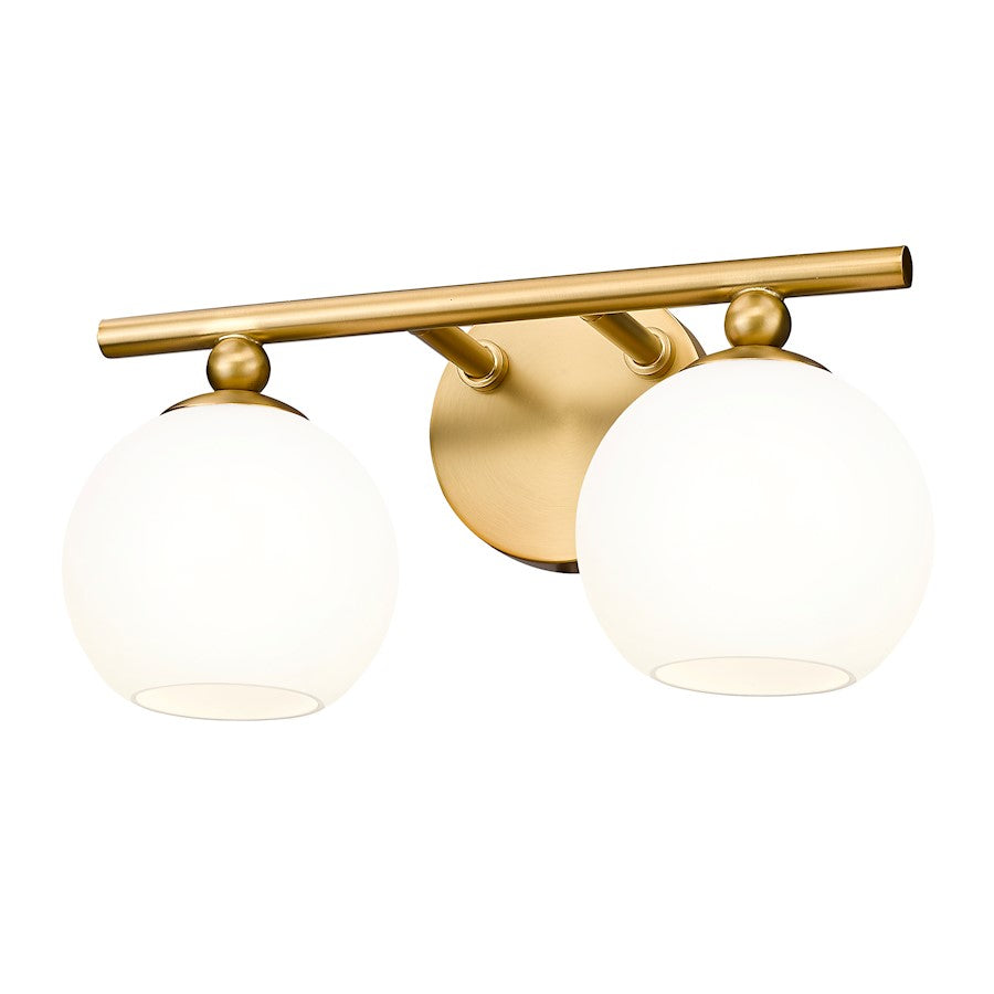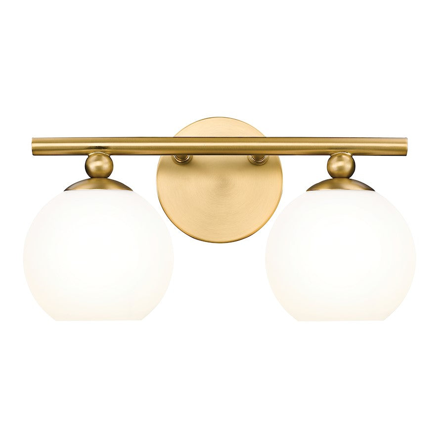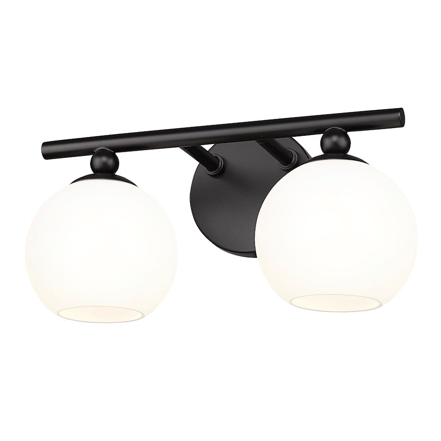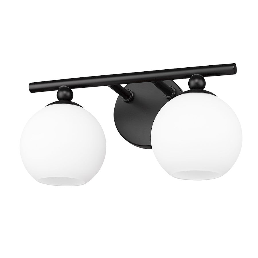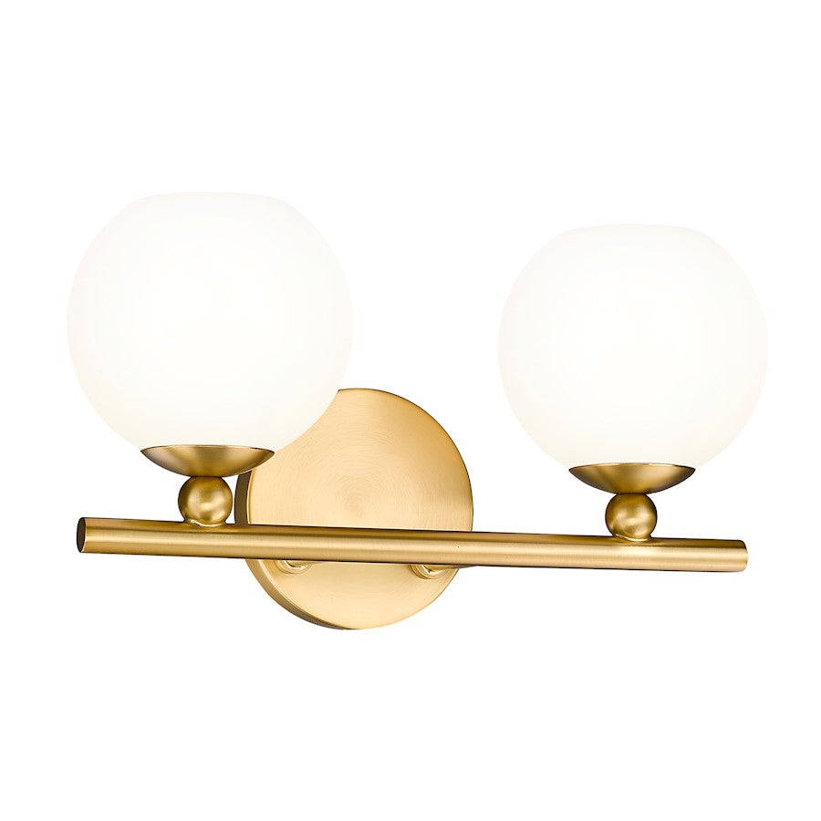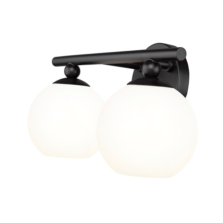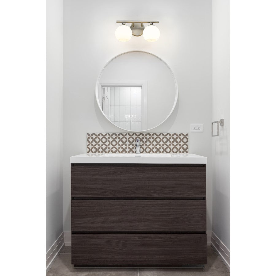 Make modern style work in an updated bath space with this two-light vanity light from the Neoma collection. Symmetry and a hint of festive retro influence blend to add an outspoken design aesthetic featuring side-by-side opal etched glass globe shades affixed to a minimalist frame made of brushed nickel or chrome or matte black or modern gold finish steel. This contemporary vanity light transforms a master ensuite or guest bath into a haven for style.