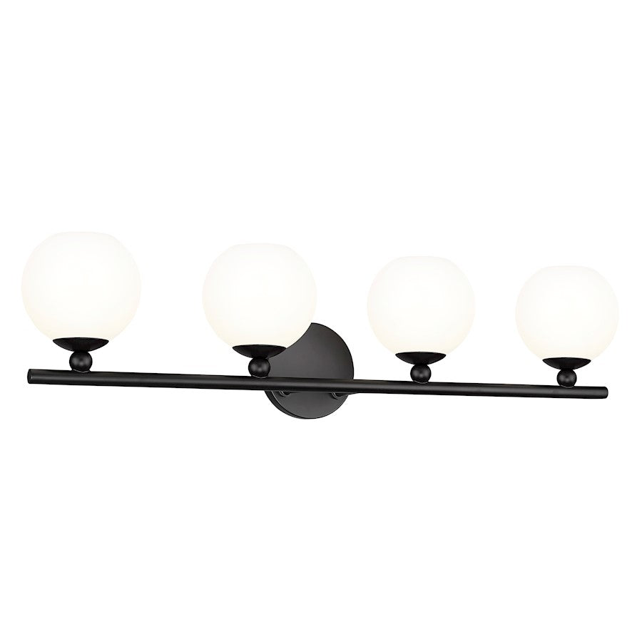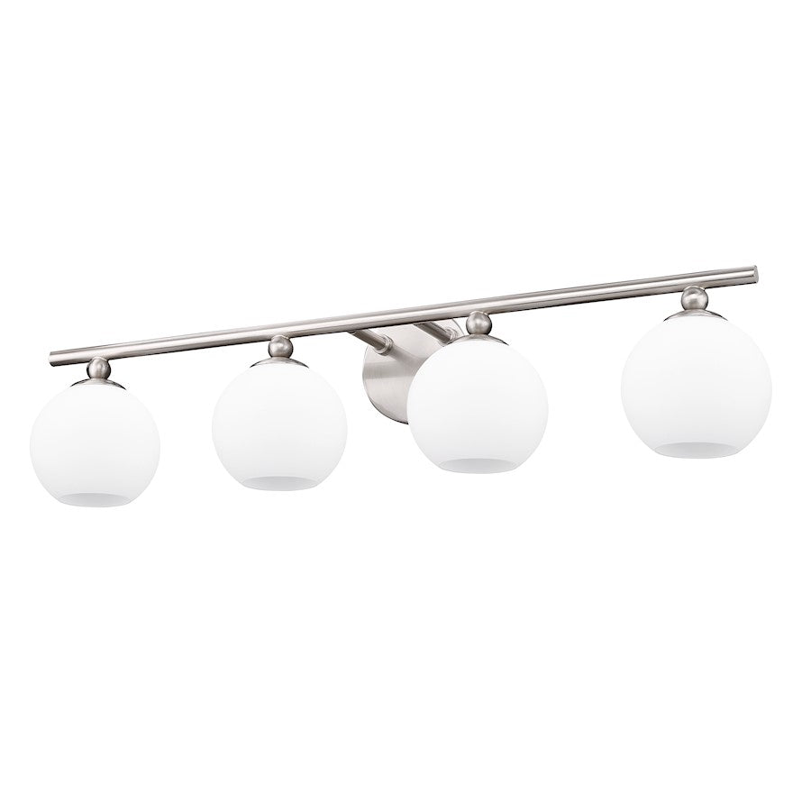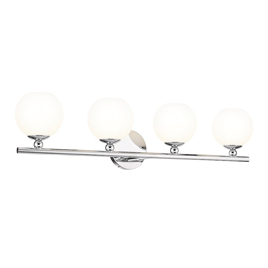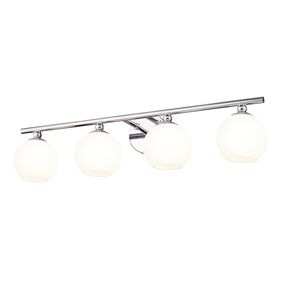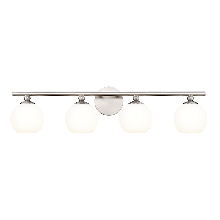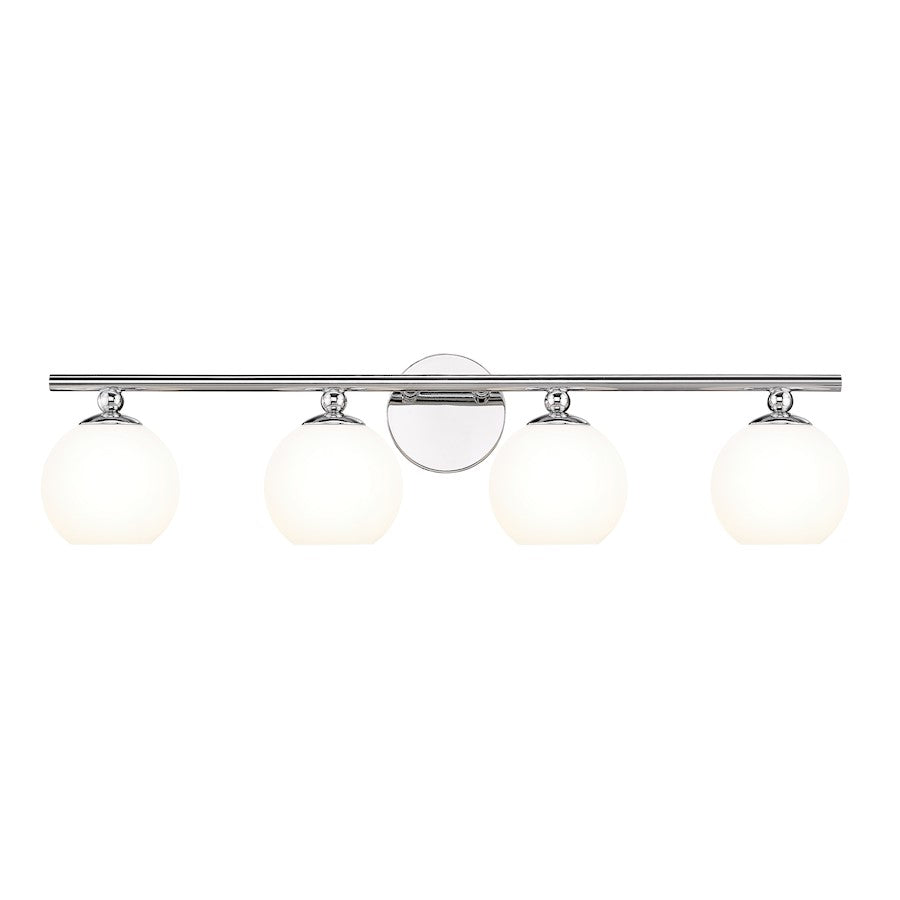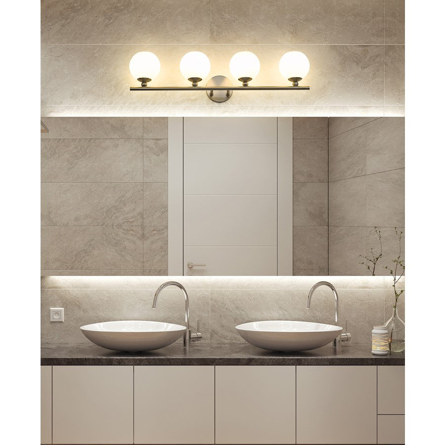 From the Neoma collection comes a tastefully elegant yet festive and fun fixture perfect for modern ensuite or guest bath spaces. This four-light vanity wall light shows off iconic globe shades made of opal etched glass, all affixed to a minimalist-inspired frame and mount crafted of brushed nickel or chrome or matte black or modern gold finish steel. The expressive personality of a wall light with a hint of retro influence delivers personality along with ambient lighting for a contemporary bathroom.