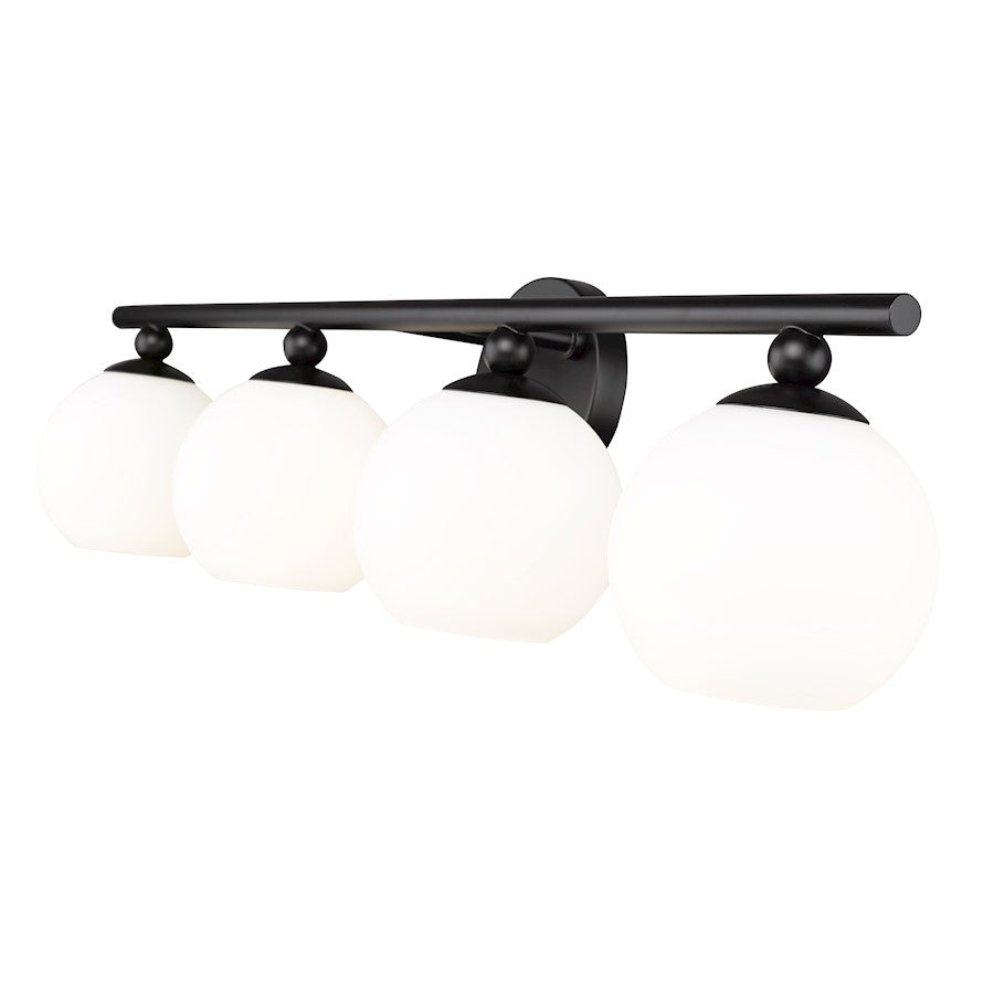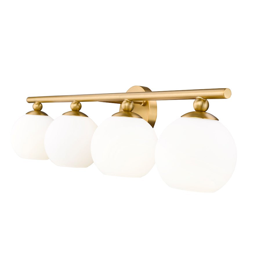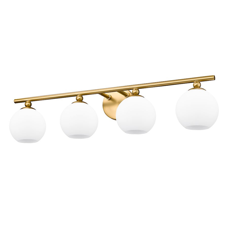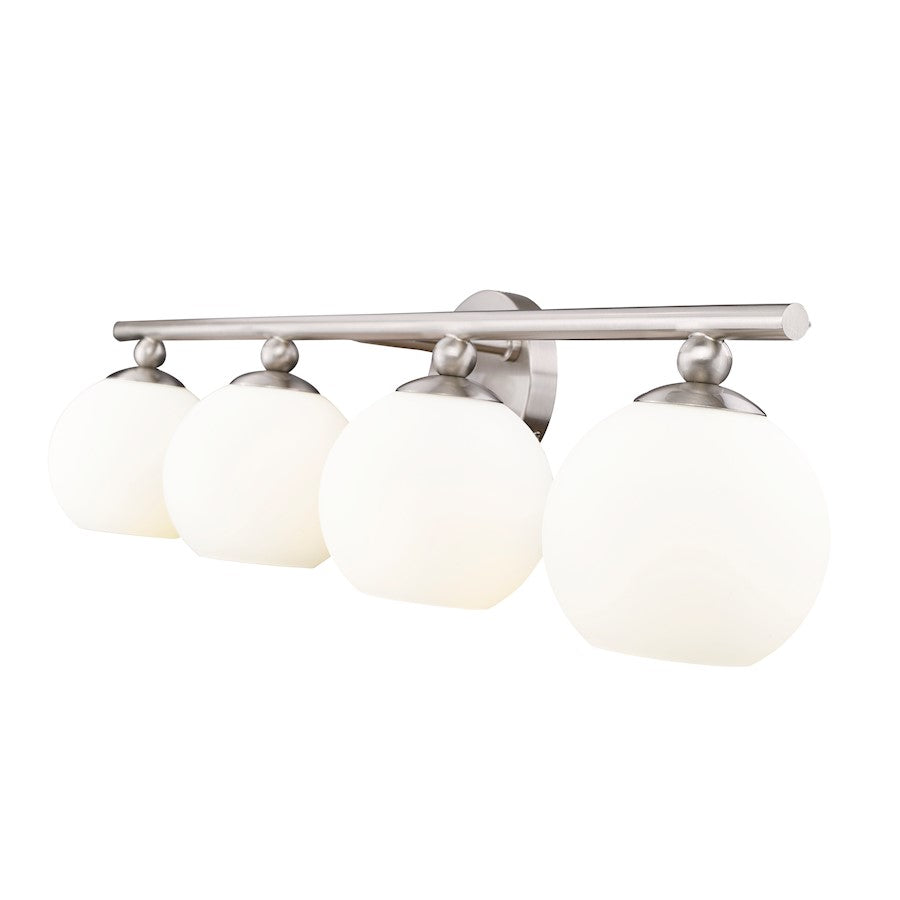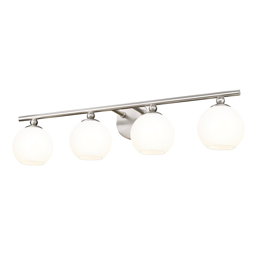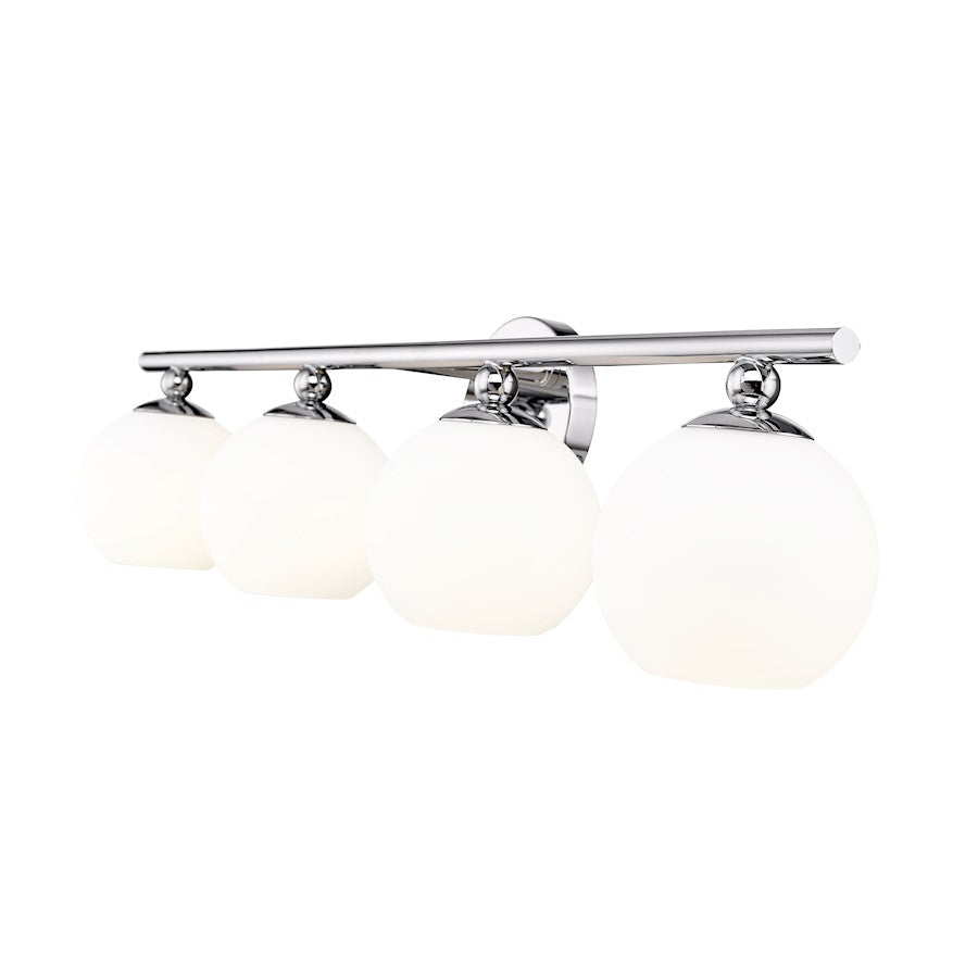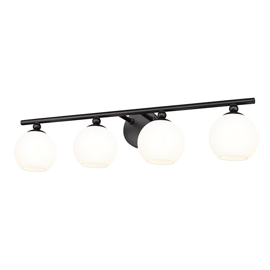 From the Neoma collection comes a tastefully elegant yet festive and fun fixture perfect for modern ensuite or guest bath spaces. This four-light vanity wall light shows off iconic globe shades made of opal etched glass, all affixed to a minimalist-inspired frame and mount crafted of brushed nickel or chrome or matte black or modern gold finish steel. The expressive personality of a wall light with a hint of retro influence delivers personality along with ambient lighting for a contemporary bathroom.
