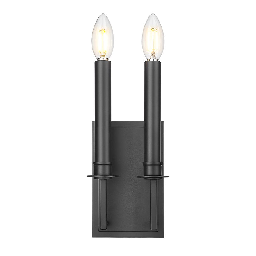 A pair of elegant candelabra holders sit side by side, creating a hint of romance in this otherwise modern wall sconce. Iconic with a storied motif, this fixture features matte black finish steel framing with angular and linear accents, perfect for entryways, living rooms, and dining spaces. Dimmable lighting tells the story of mood creation and adjustable levels to suit time-of-day conditions.