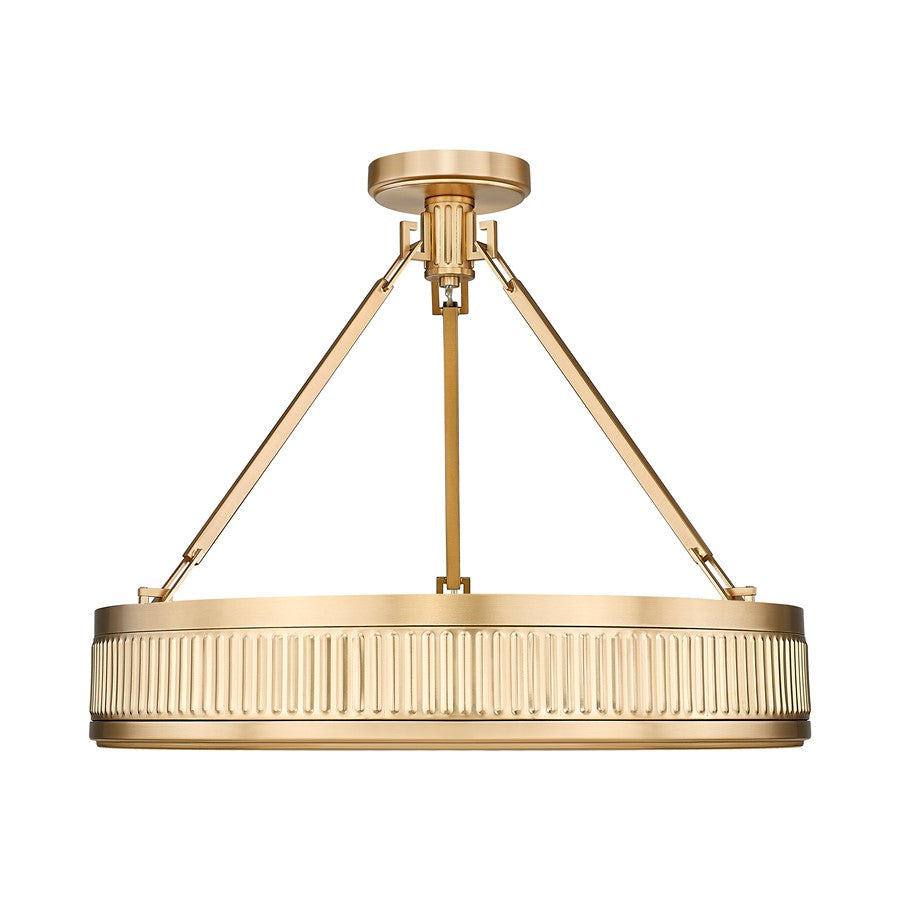 Capture mid-century design aesthetics with the intriguing textured band details featured on this modern three-light semi-flush mount ceiling light. Beautiful over a living room seating group or chic bedroom, it offers an opaque diffuser and a rich, warm modern gold finish for wonderful ambiance. This fixture is equipped with a Z-Lite EZ change LED module that offers energy efficiency, light color selectability, and dimming capabilities.