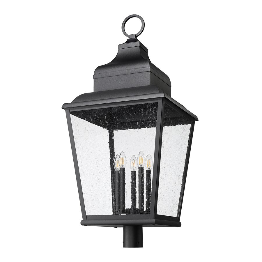 A twist on iconic lantern-inspired design, this five-light outdoor post mount fixture enhances residential or commercial exterior settings with a village motif. Sand black finish aluminum crafts a tapered frame with a tall, detail-rich roof, as clear seedy glass panels inspire with a bit of romance. Candelabra-style holders reflect a romantic ambience in a dimmable light perfect for round-the-clock illumination.