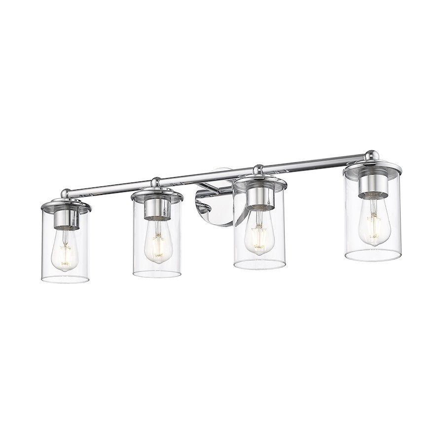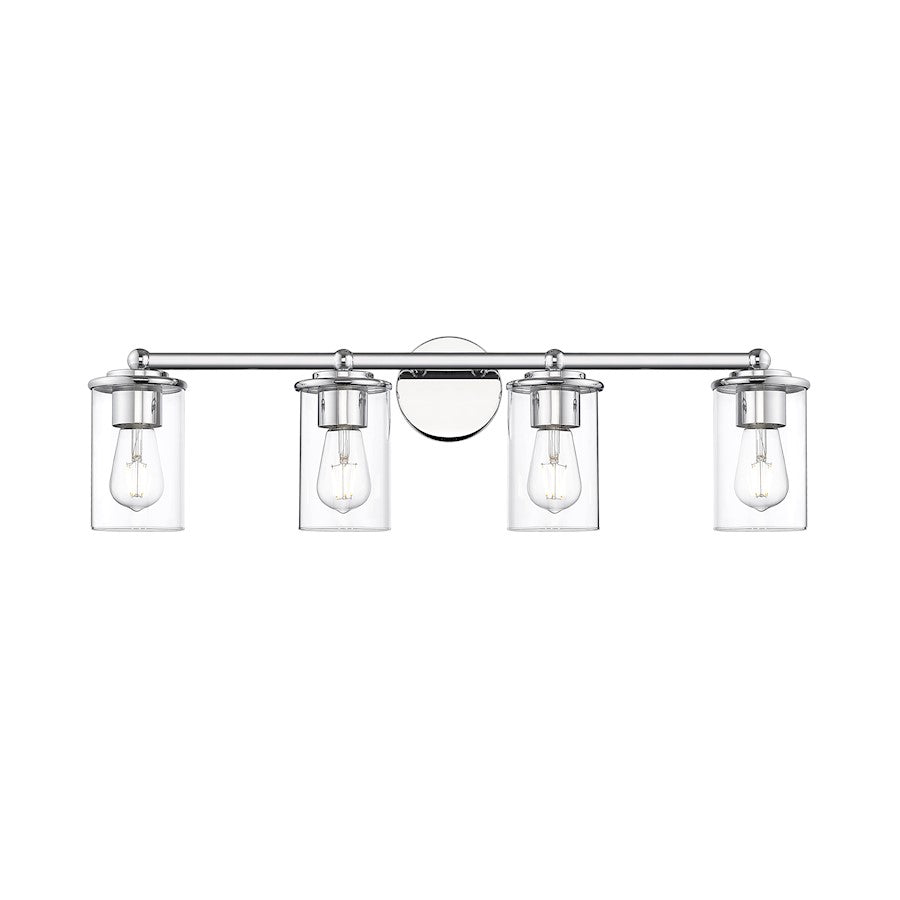 Appreciate the versatility of modern simplicity in a chic, modern four-light vanity fixture. From the Thayer collection, it's a charming, understated design that pairs graceful curvature with a shining chrome finish and cylinders of crystal clear glass for bright, direct illumination ideal for a master or guest bath.